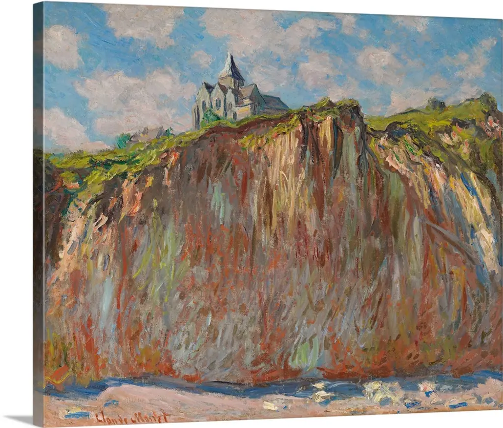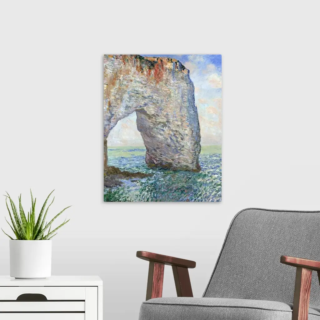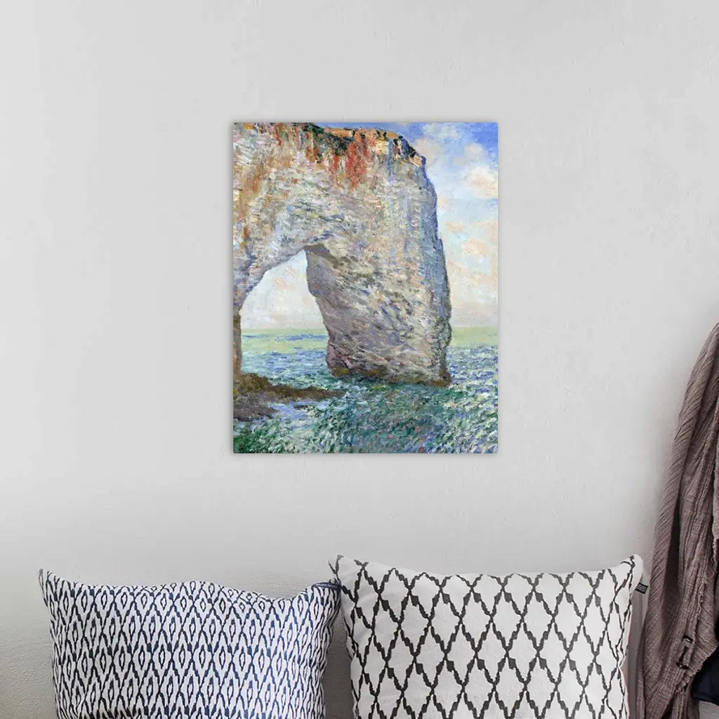 In 1886, the writer Guy de Maupassant published his eyewitness account of Monet at Etretat. The artist walked along the beach, followed by children carrying five or six canvases representing the same subject at different times of the day and with different effects. He took them up and put them aside by turns according to changes in the sky and shadows. Monet painted the dramatically arched projection in the cliff at Etretat six times from this angle: twice during each of three visits to the Normandy coast in 1883, 1885, and 1886. He refined the pictures in his studio.