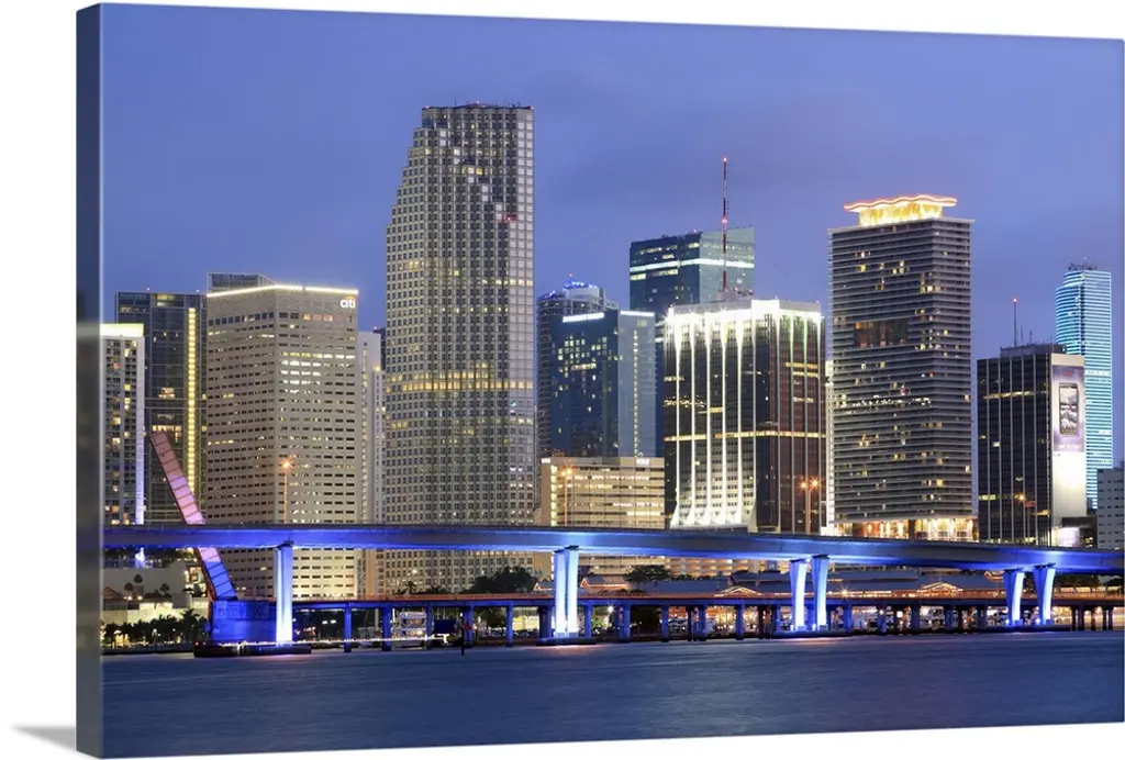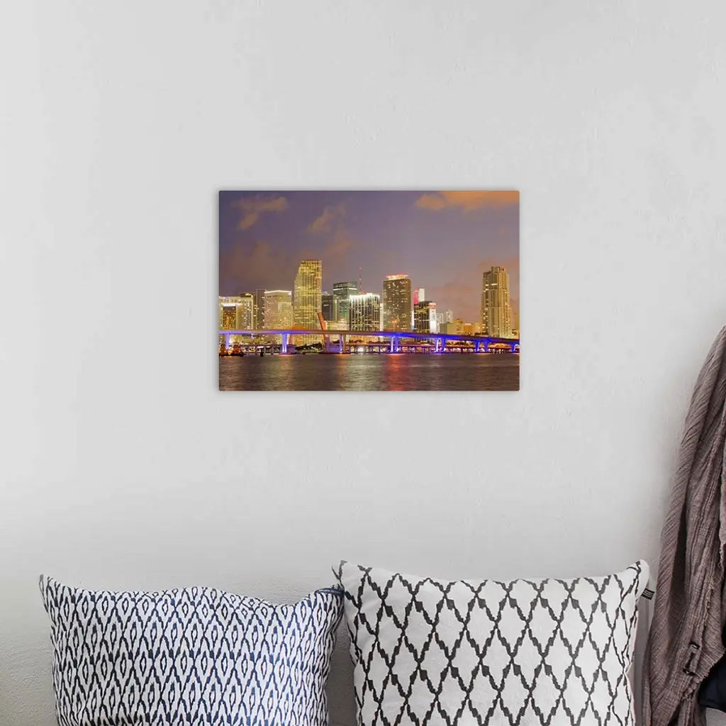 The Miami causeway and skyline at night.