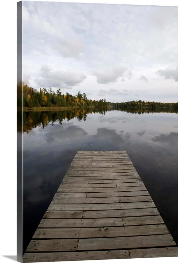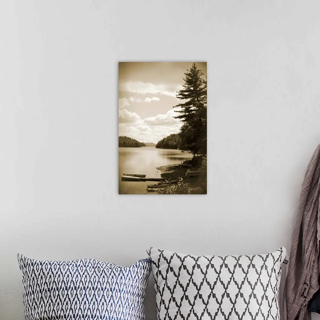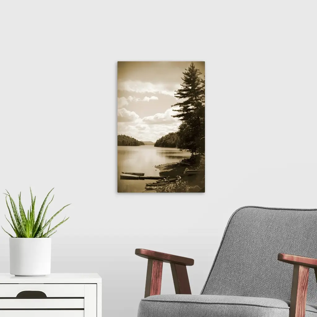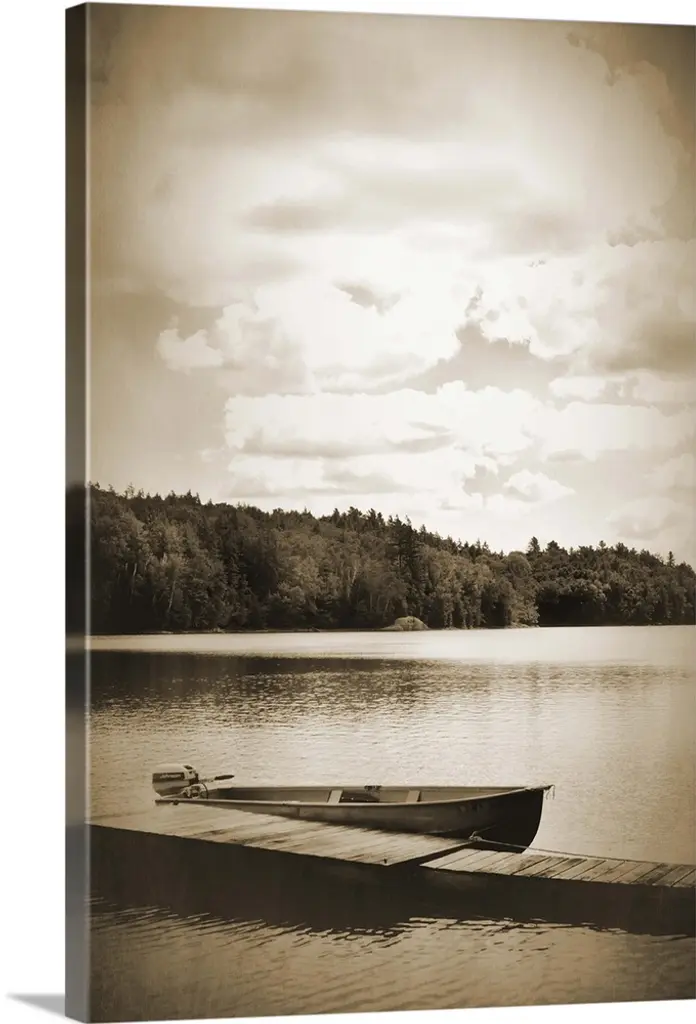 Sepia toned photograph of a boat dock floating gently in a lake, with a boat docked beside it.
