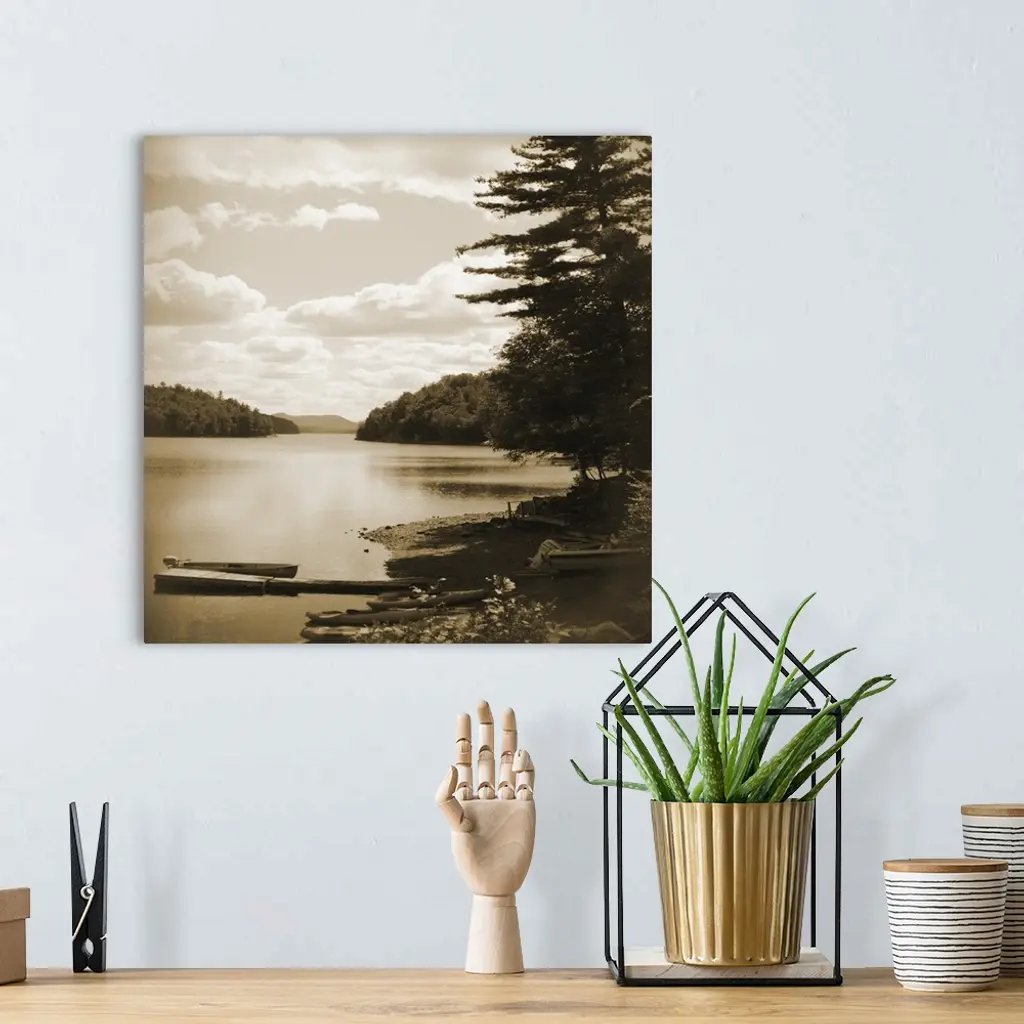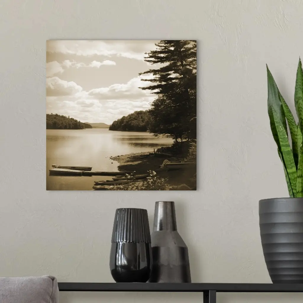 Sepia toned photograph of an idyllic wilderness scene, with lake and forest.
