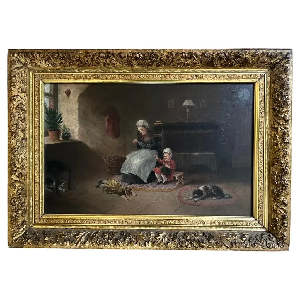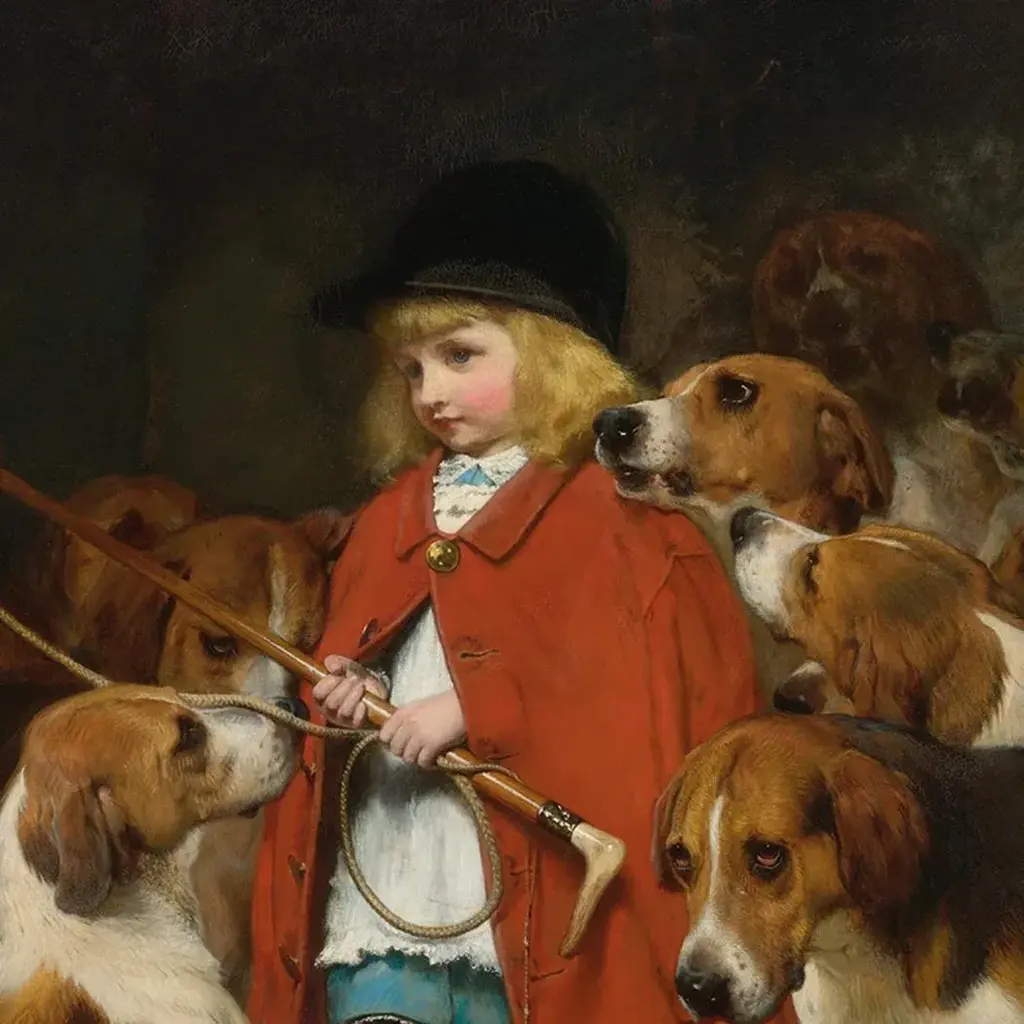 This darling print of a young fox hunter whipper and her hounds is lovely Victorian style wall decor. Just right for your antique style home, or for the equestrian or fox hunter. Would look great with English country decor! Reproduction print of the original work by English painter Charles Burton Barber (1845-1894). Each high-resolution image is printed with archival quality ink on matte canvas, board-mounted, then treated with a special varnish to give it a more authentic oil painting look. Each work is custom framed in a 3-1/4" wide antiqued gold resin frame, and the back is finished with craft paper and a saw tooth hook or wire hanger. • Painting print: 8" x 10" • Finished frame size: 14" x 16" • Frame width: 3-1/4"