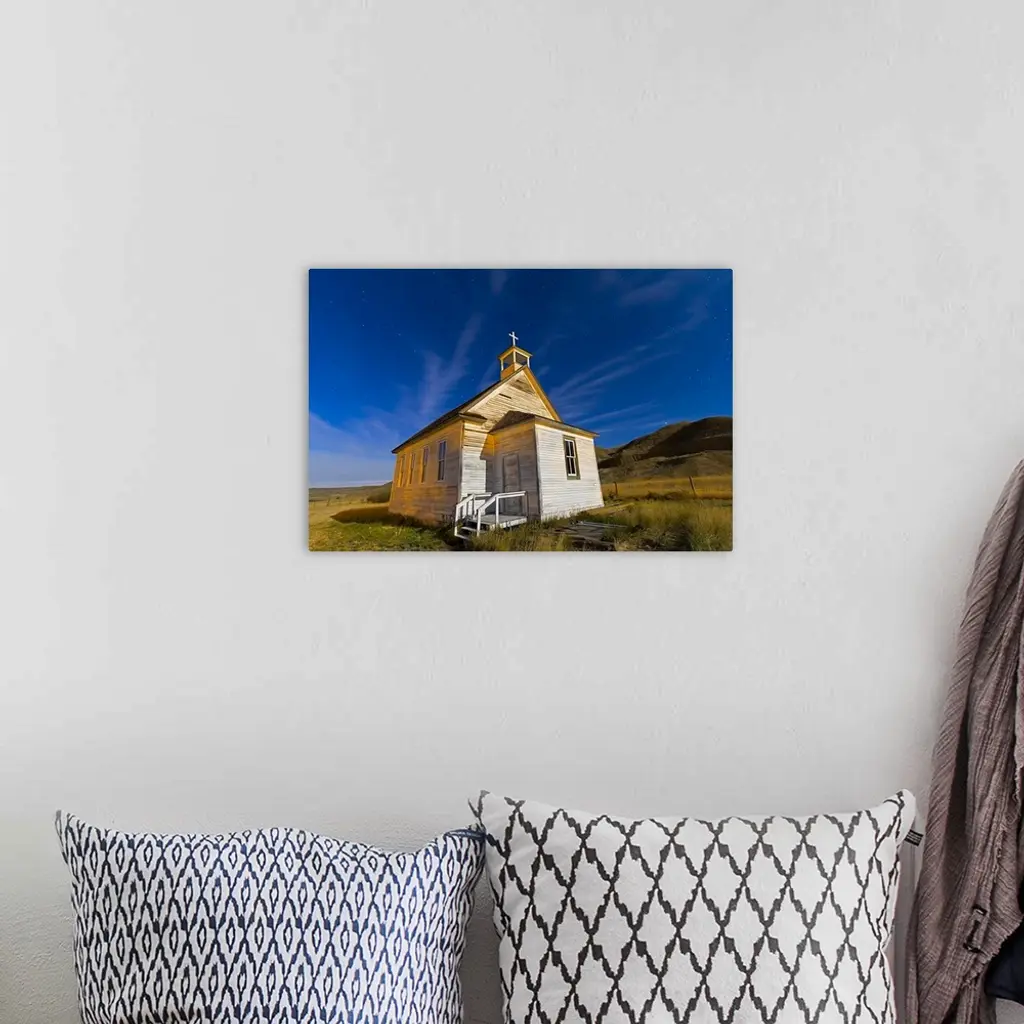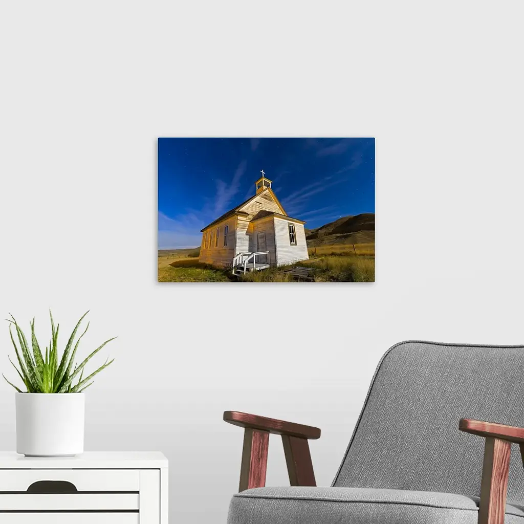 October 9, 2011 - The old pioneer church in Dorothy, Alberta, Canada, on a starry night illuminated by moonlight.