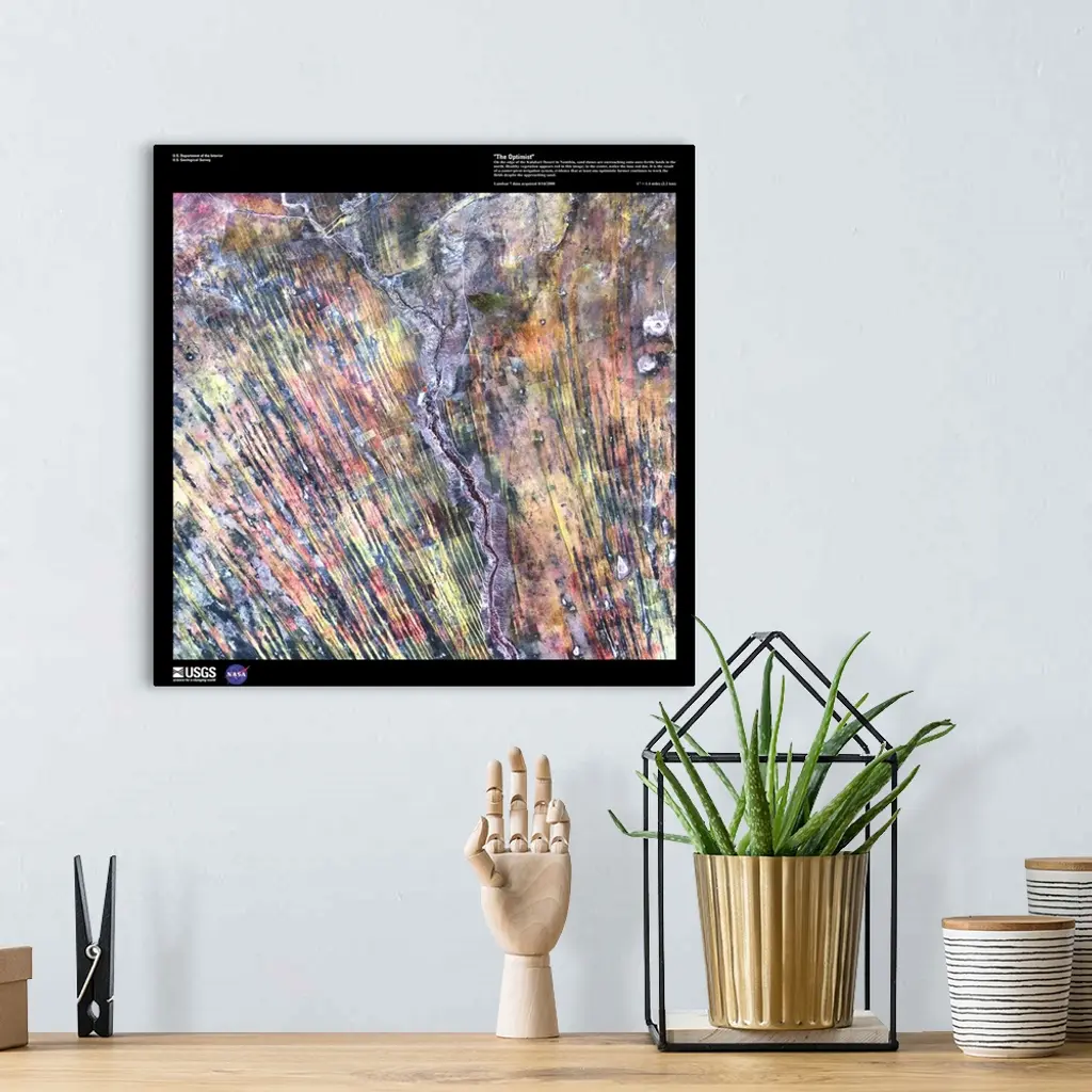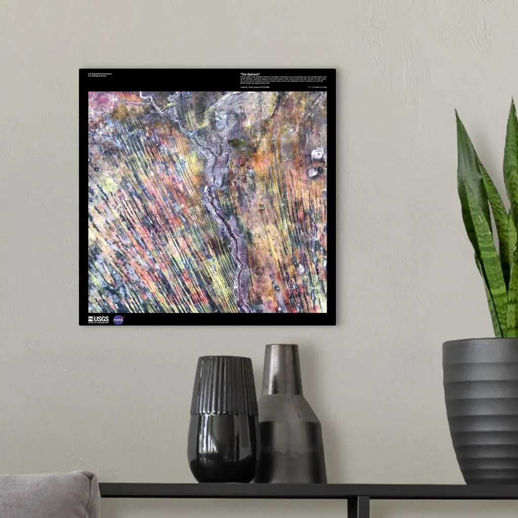 On the edge of the Kalahari Desert in Namibia, sand dunes are encroaching onto once-fertile lands in the north. Healthy vegetation appears red in this image; in the center, notice the lone red dot. It is the result of a center-pivot irrigation system, evidence that at least one optimistic farmer continues to work the fields despite the approaching sand. August 1, 2000.