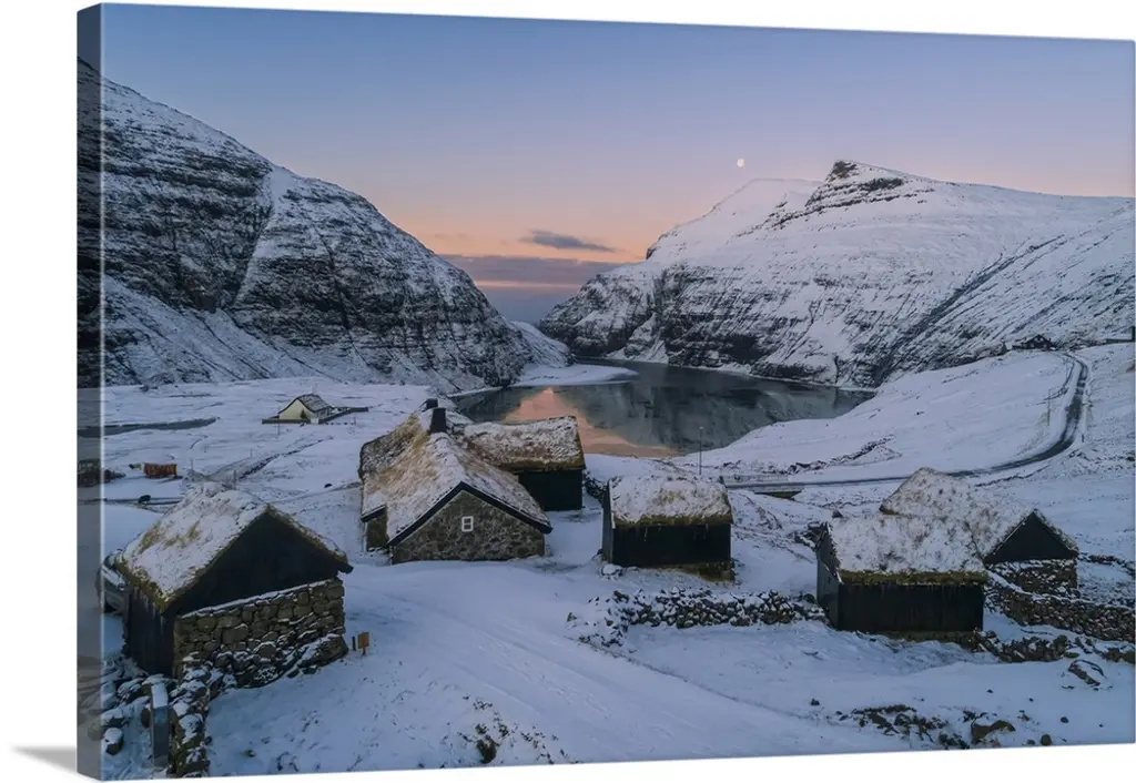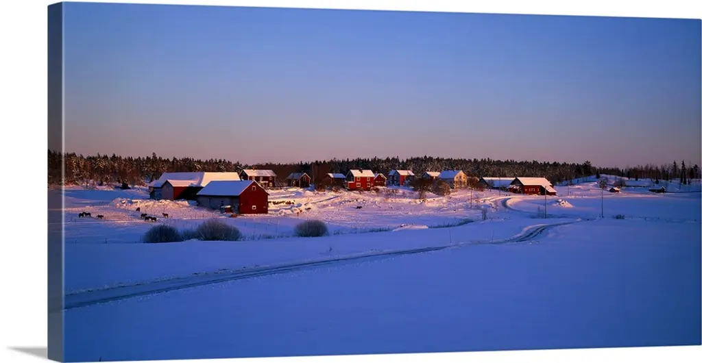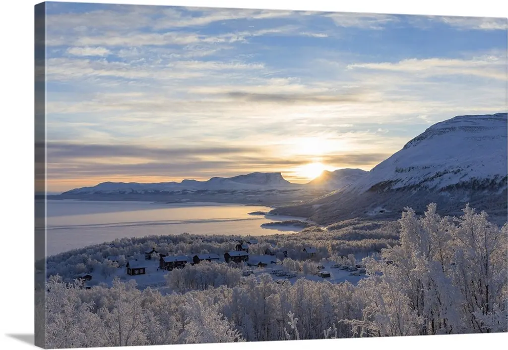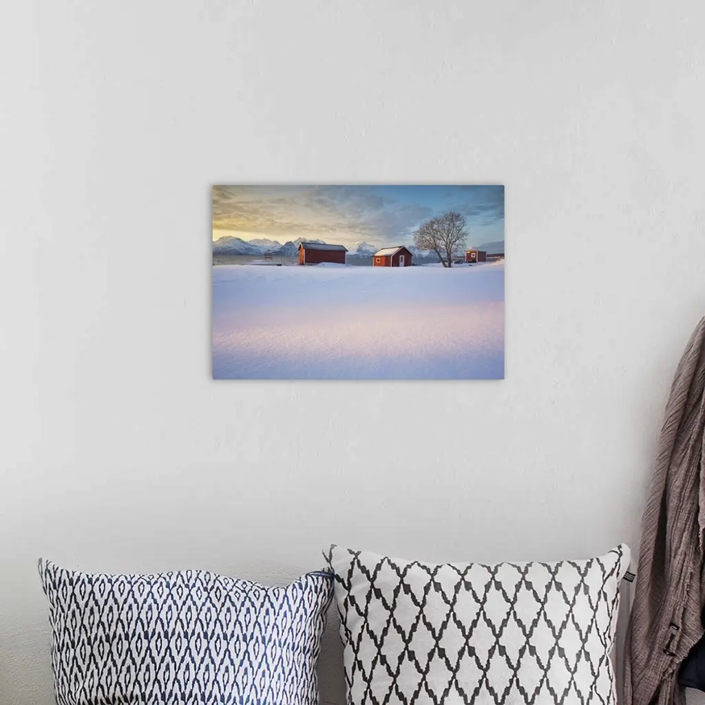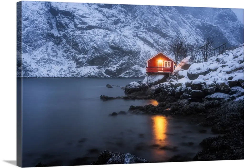 The Orange Sky At Sunset Frame The Frozen Sea And Typical Rorbu Immersed In The Snow