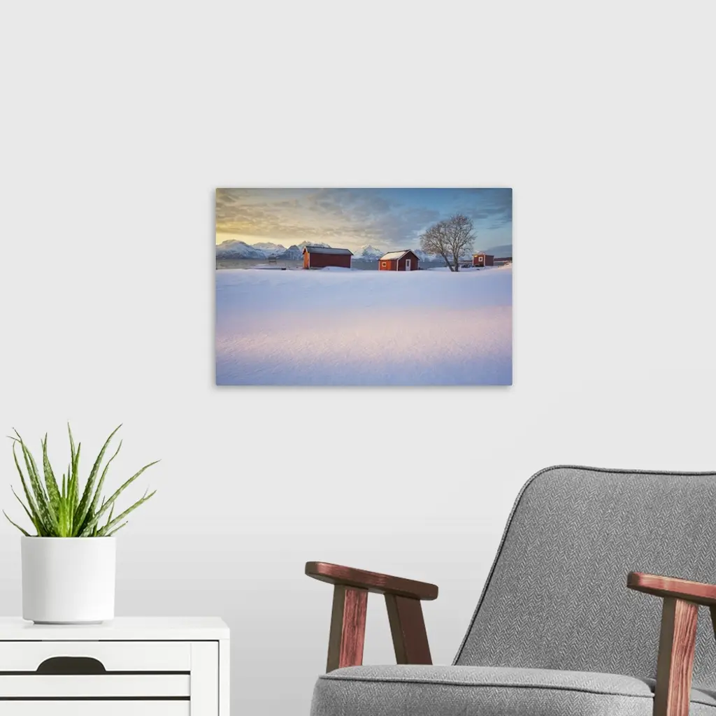 The orange sky at sunset frame the frozen sea and typical Rorbu immersed in the snow Djupvik Lyngen Alps Tromso Norway Europe