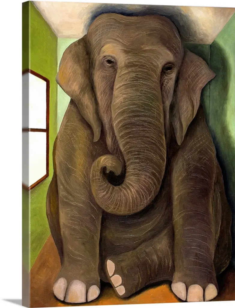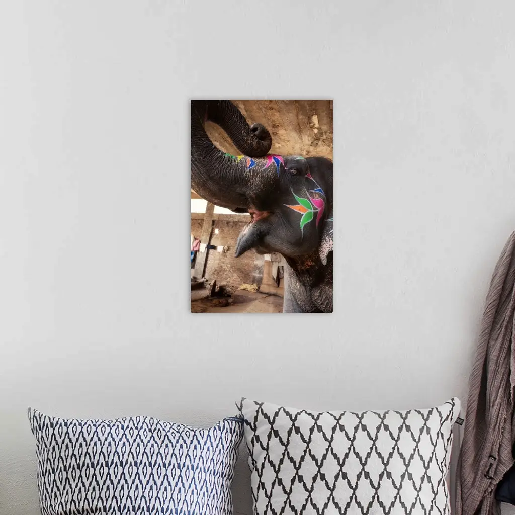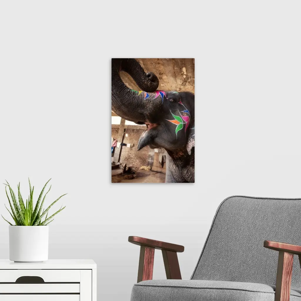 The mouth open, trunk up, painted elephants in Jaipur, India.