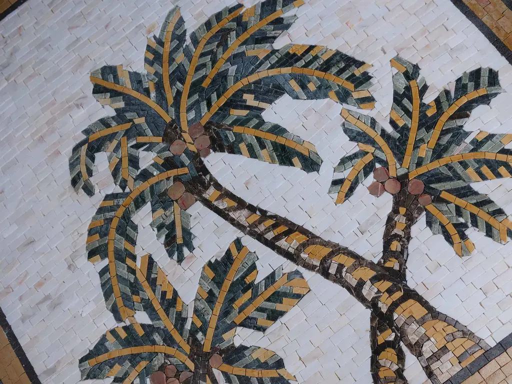 Introducing "The Palms - Mosaic Artwork," a stunning piece that captures the essence of tropical elegance and natural beauty. This magnificent artwork showcases the vibrant greens and warm yellows of palm trees, bringing a touch of paradise directly into your home or business environment. Each mosaic is meticulously handcrafted from high-quality marble stones, ensuring that every piece is unique in design and character. The intricate patterns and colors are thoughtfully arranged to create a visual symphony that evokes feelings of relaxation and tranquility, reminiscent of sun-kissed shores and swaying palm fronds.Versatile in its application, "The Palms" is designed to enhance any space. Whether you choose to display it as a striking wall feature or lay it down as an exquisite floor piece, this mosaic artwork elevates your interior decor and creates a sense of harmony and sophistication. Its durable construction means it will stand the test of time, remaining a cherished focal point in your home for years to come.Perfect for living rooms, entryways, kitchens, or even outdoor spaces, "The Palms" invites the soothing energy of nature indoors. Ideal for those who appreciate the beauty of artisan craftsmanship, this artwork serves as a reminder of tranquil moments spent in lush surroundings.Transform your space with "The Palms - Mosaic Artwork," where craftsmanship meets nature, creating a lasting impression that inspires serenity and warmth. Make it a part of your collection today and experience the harmonious blend of color and artistry that only a handcrafted mosaic can offer.