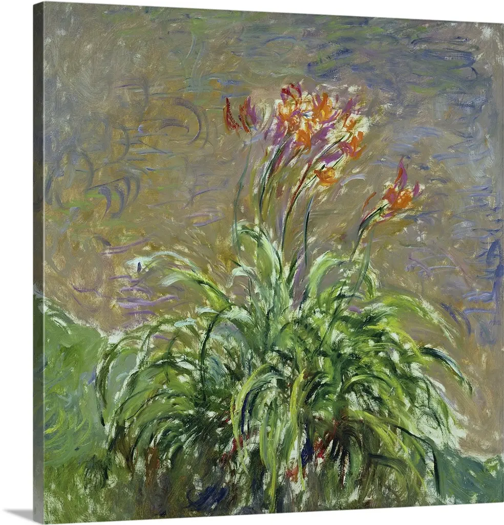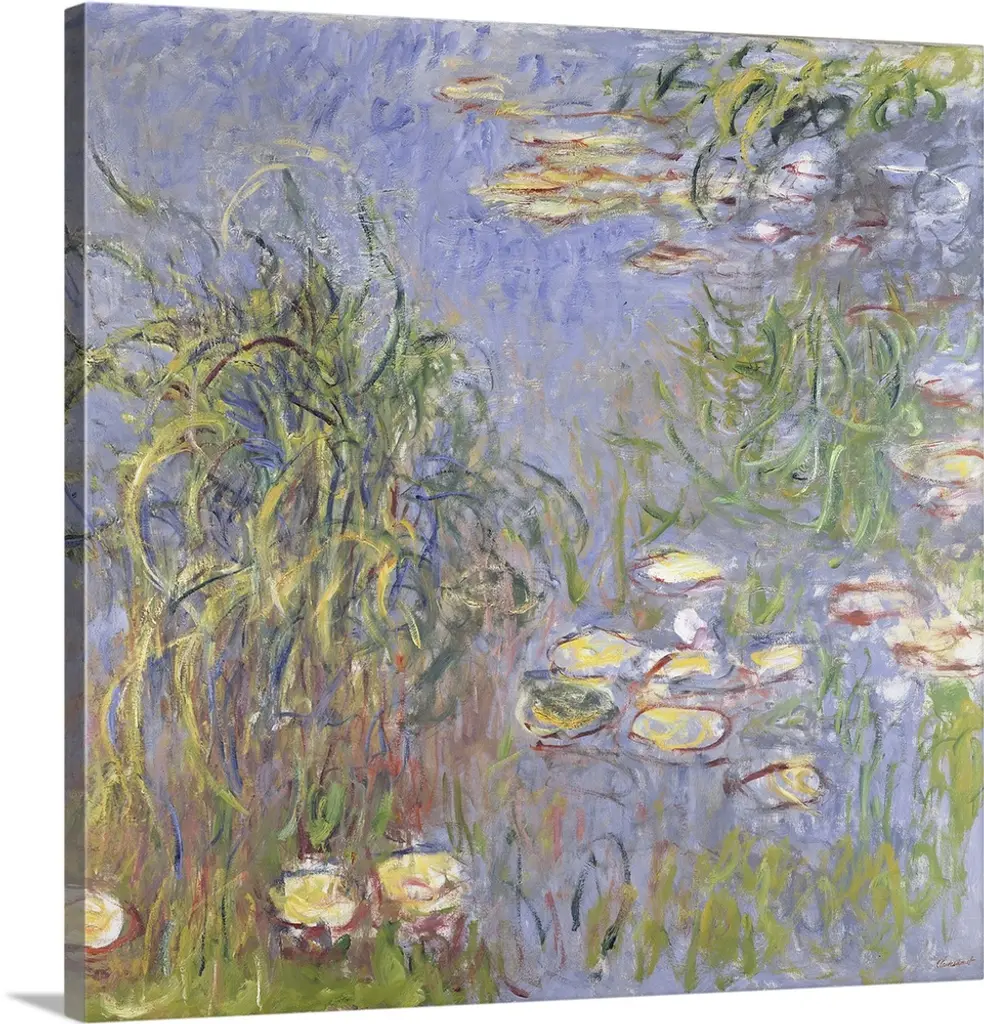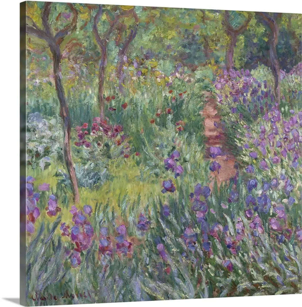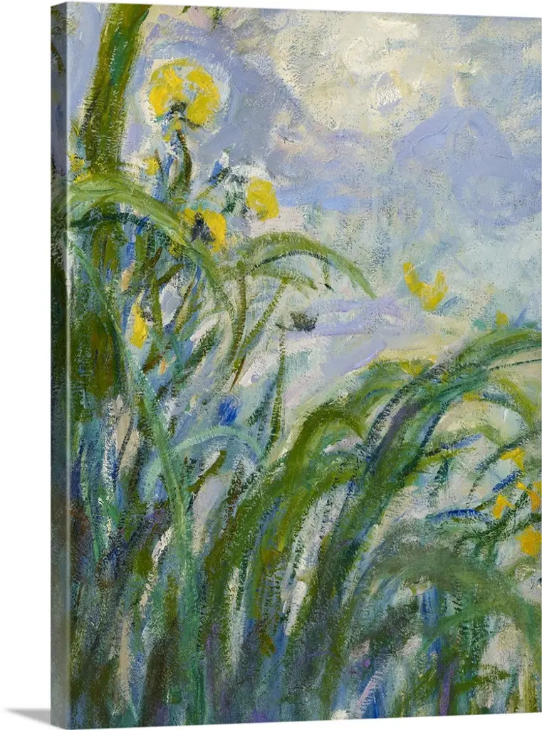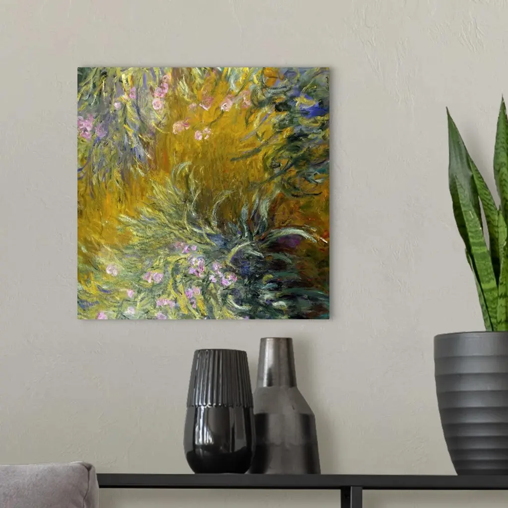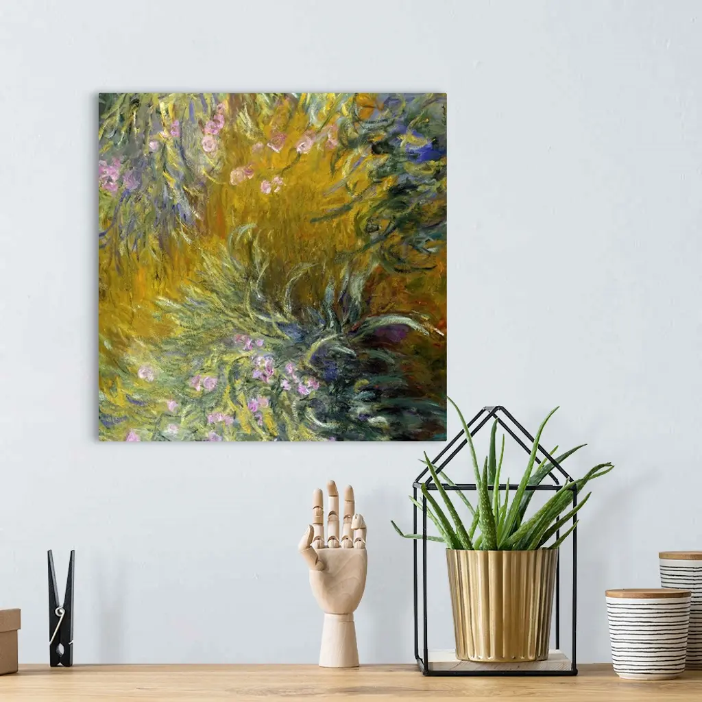 Irises, among Monet's favorite flowers, lined the pathways leading up to the house and Japanese bridge on the artist's property at Giverny. This bird's-eye view of a garden path belongs to a series of monumental works painted during the First World War that capture the vital essence of these flowers with intensity and breadth of vision. Late in life, as his eyesight faltered, he dispensed with subtlety and took in the motif in large masses, waiting until the idea took shape, until the arrangement and composition inscribed themselves on the brain.
