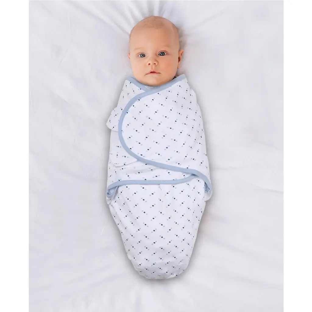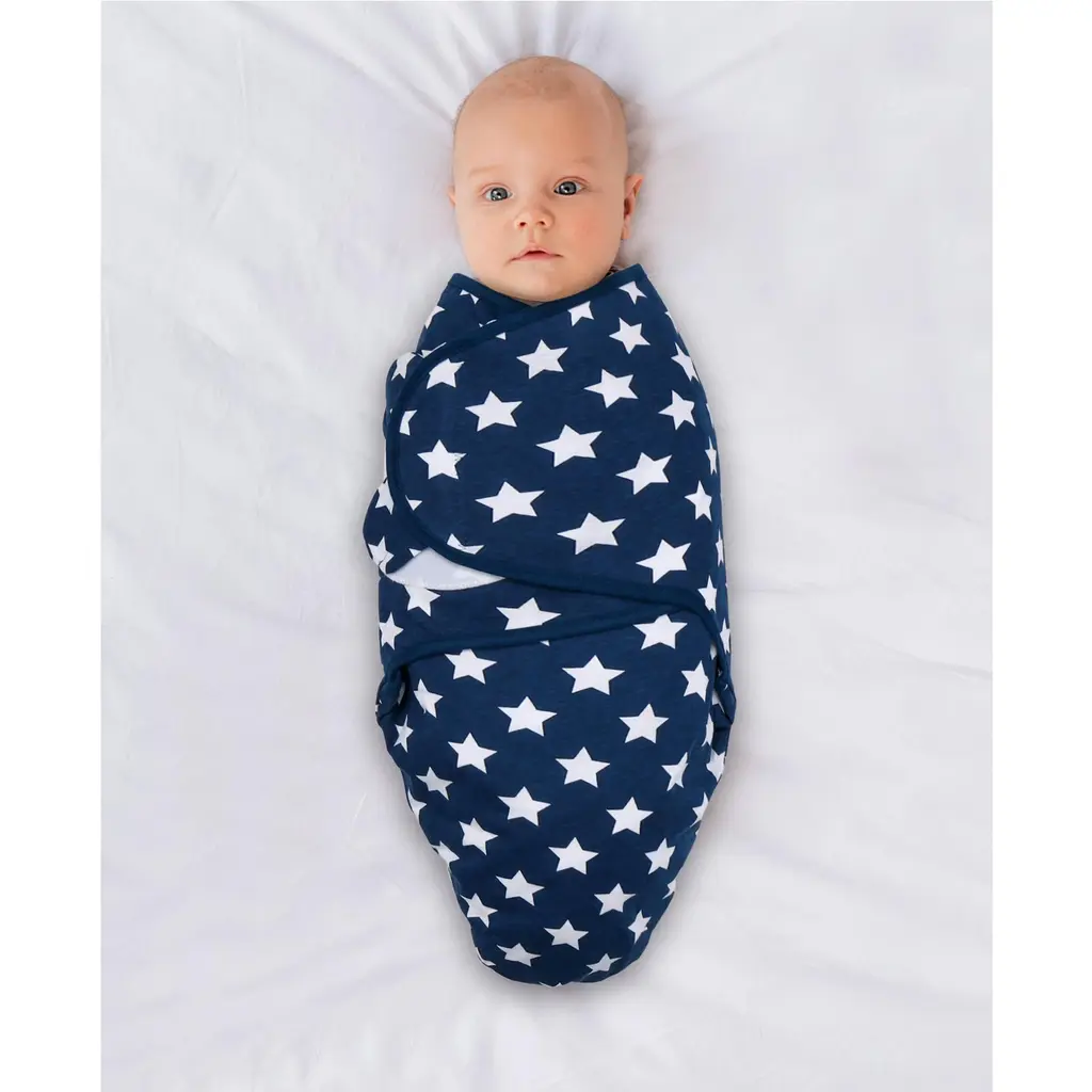Your baby will always be comfy, cozy, and stylish as they go off to sleep in The Peanutshell baby swaddle blankets! The 3-pack set is great for new moms and dads, ensuring that there will always be an extra swaddle or two on hand. A fun dino print in navy on light blue, white stars on a navy ground, and a simple geometric print in shades of blue on a clean white ground are the perfect assortment for your little one. Swaddling your baby securely is made easy with our adjustable fabric wings that fasten securely with hook and loop attachments to create the perfect fit.