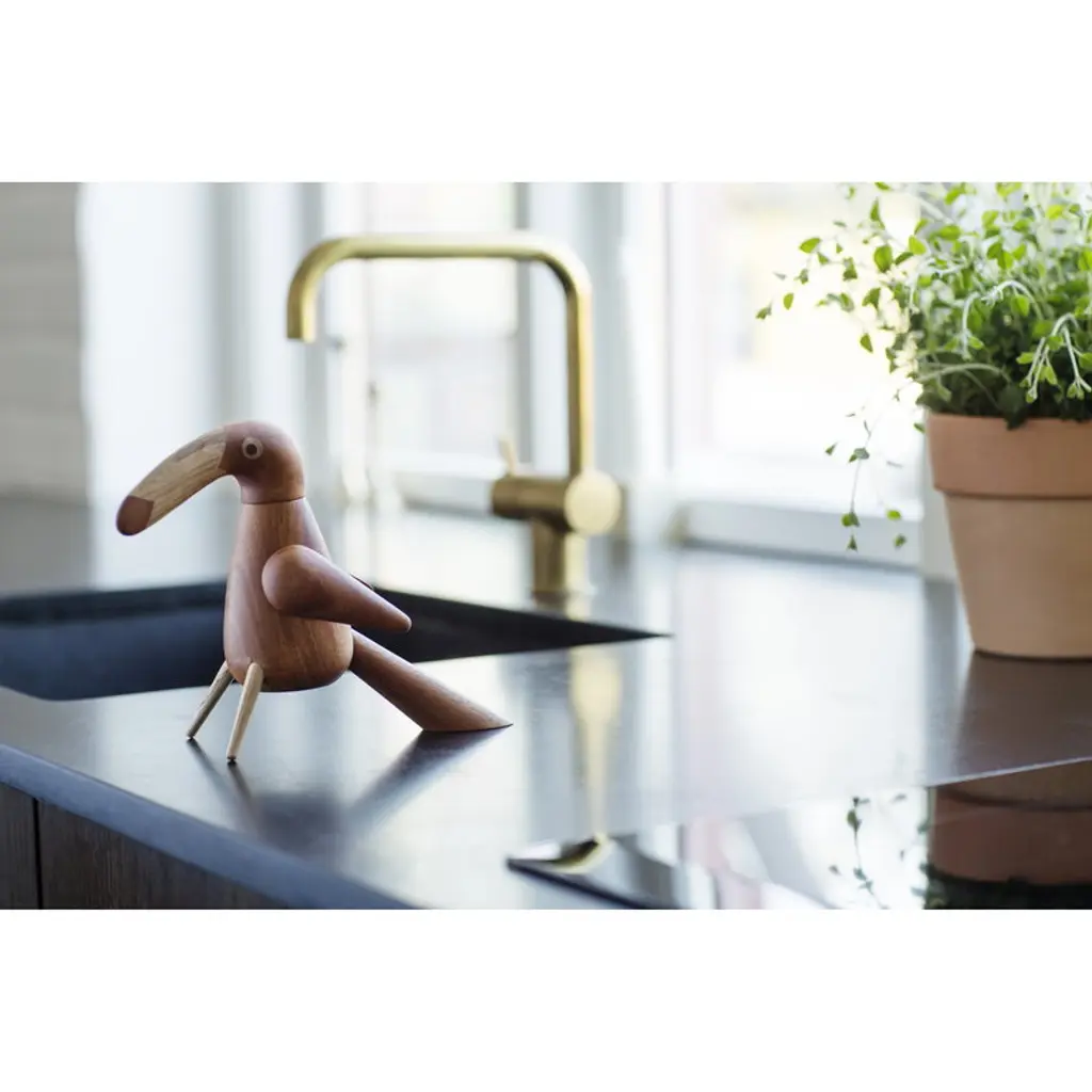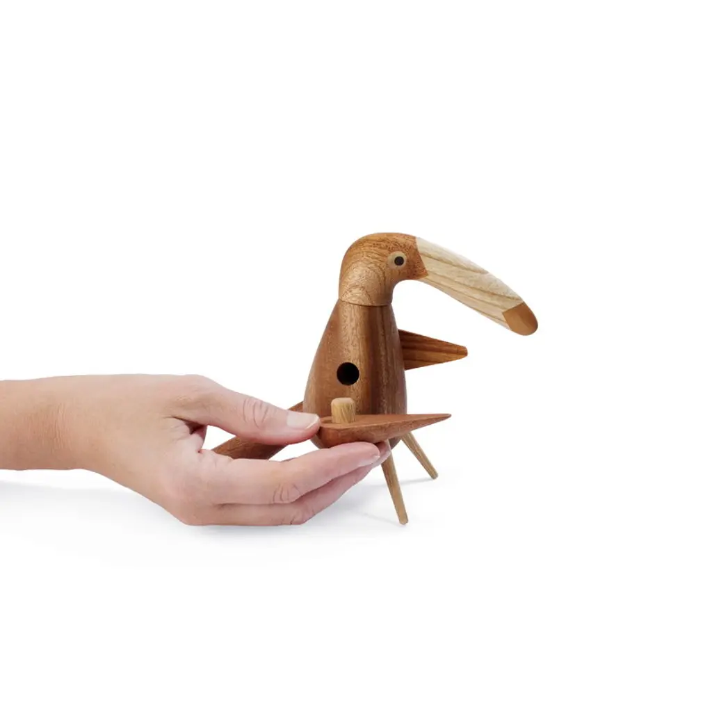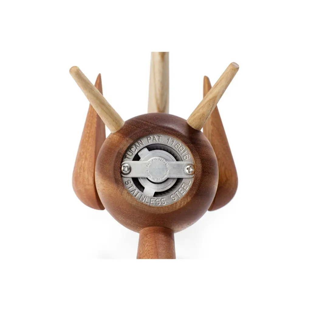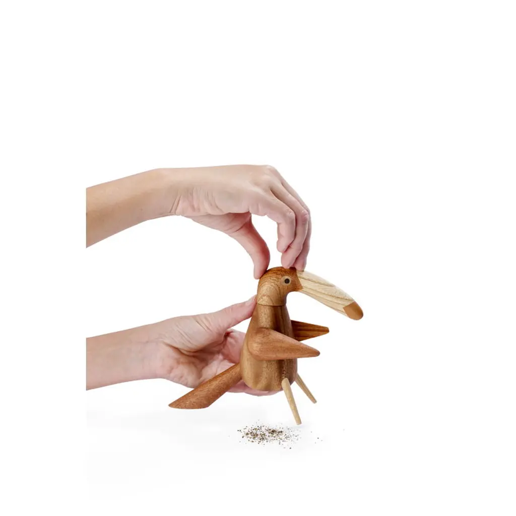 Spring Copenhagen's The Pepper Bird grinder combines high quality and craftsmanship with playful and inventive design. The grinder, made of mahogany, ash, maple and walnut, works by rotating the bird's head; the pepper is filled into the mill through the bird's removable wing. Balanced on its feet and tail, the handmade, tucan-like Pepper Bird grinder will delight you both as a utensil in the kitchen and dining area and as a decoration on a bookshelf or chest of drawers.