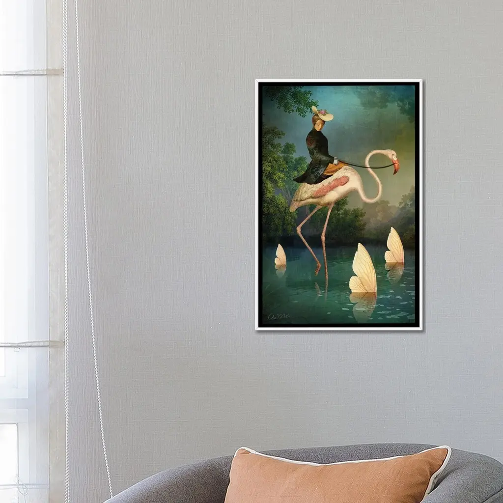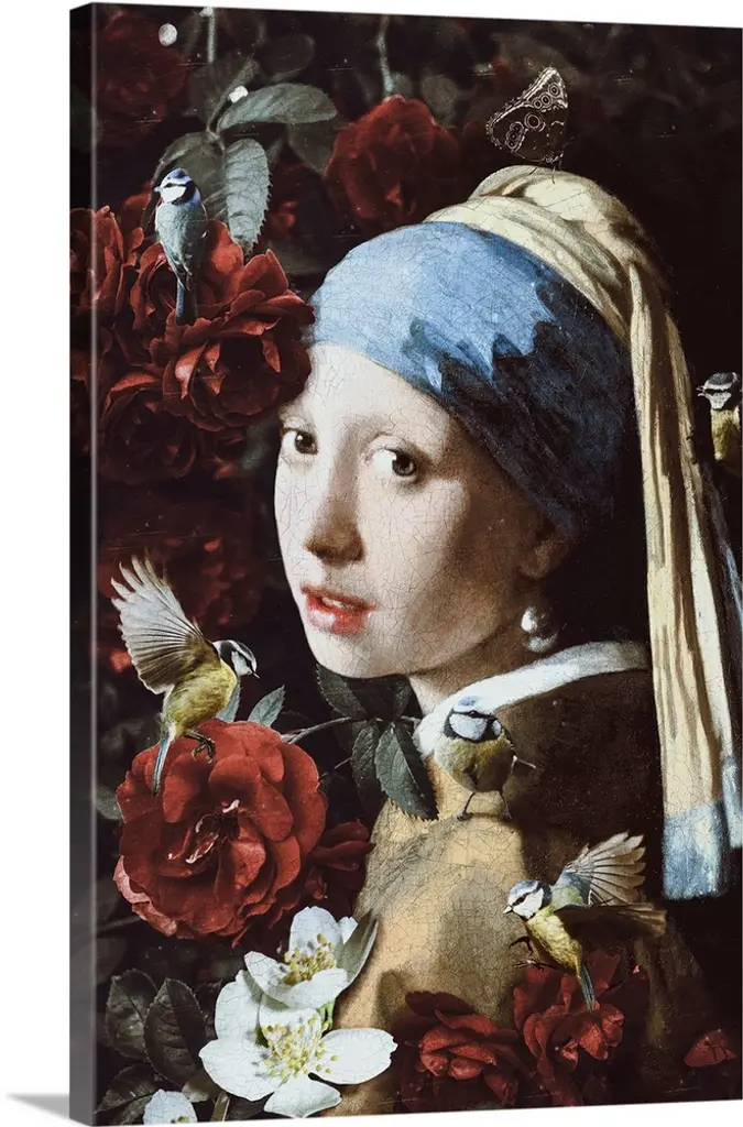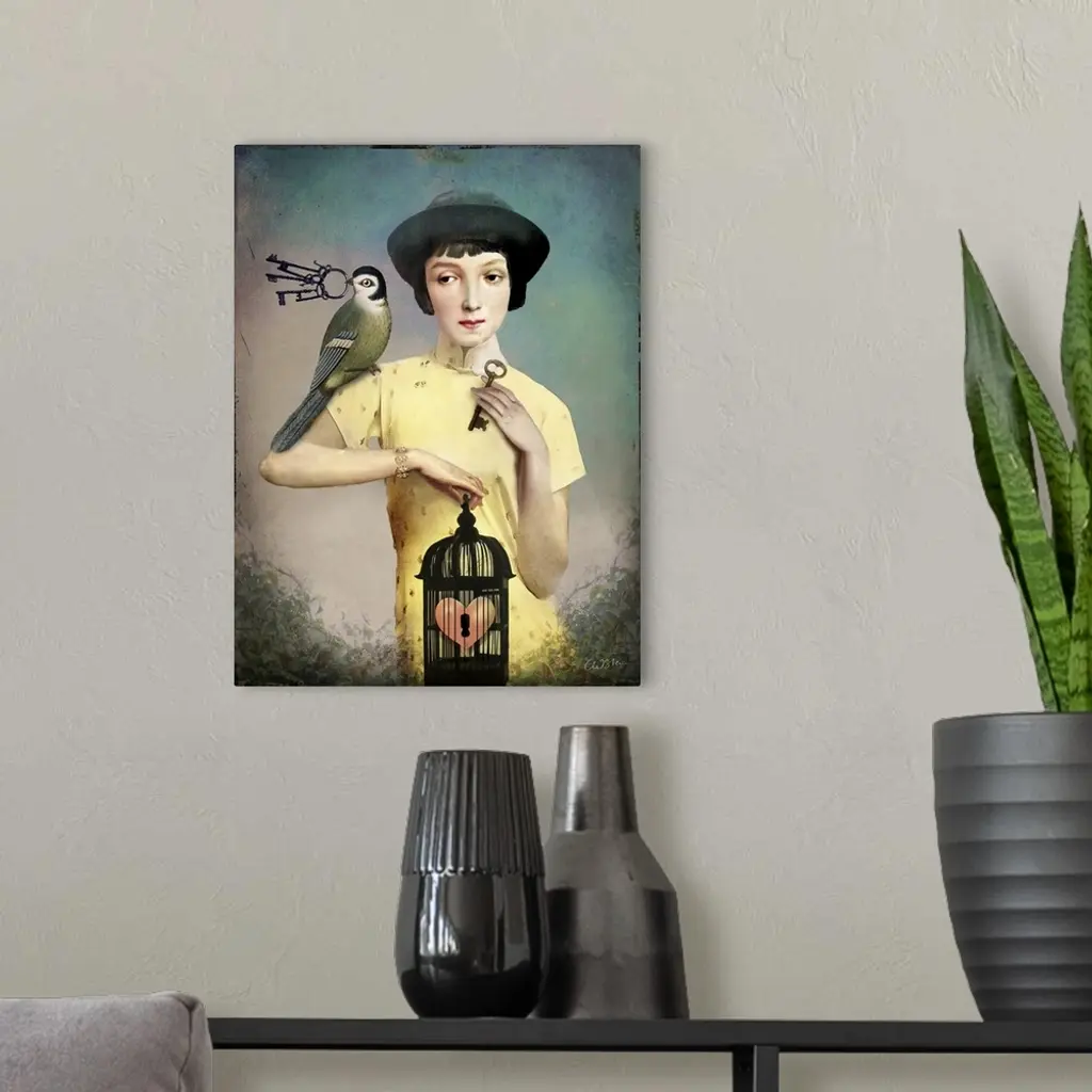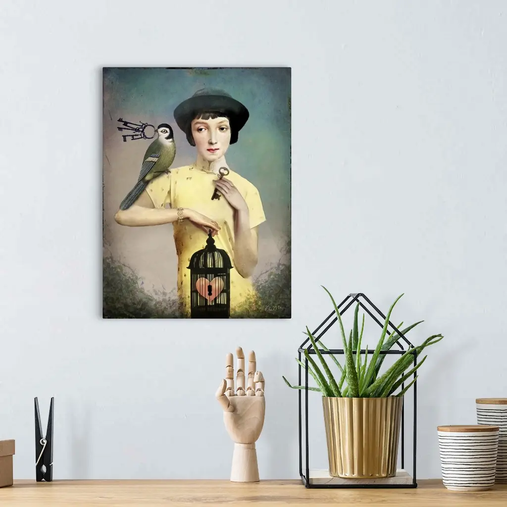 A lady in yellow is holding a key and a birdcage with a heart. A bird is perched on her shoulder and is carrying a ring of keys.
