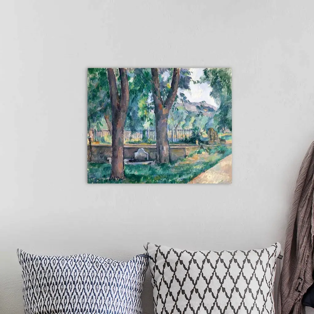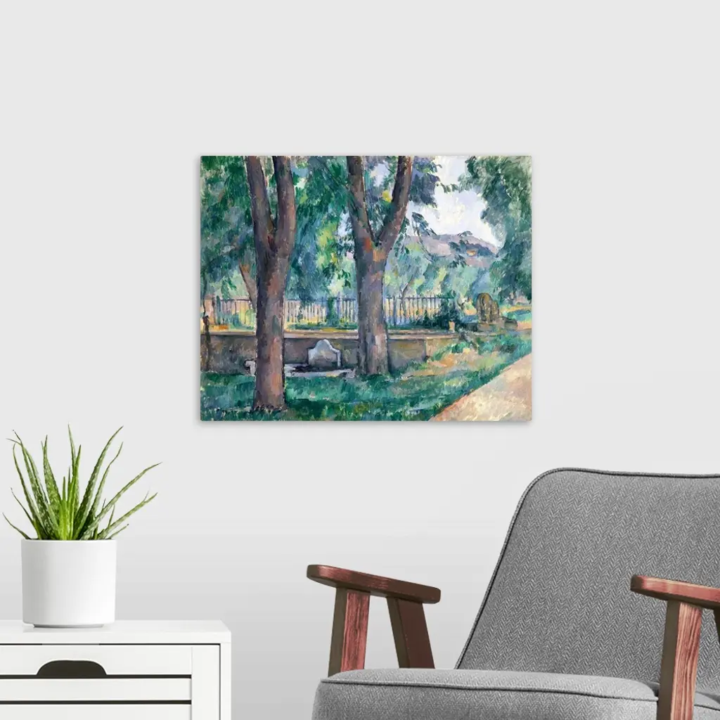 Cezanne's affection for his family's estate, the Jas de Bouffan, near Aix, is reflected in the many views he painted of the property over a quarter century. He depicted the road at the lower right in this composition several times in the late 1880s. Bordered with chestnut trees, it led from the back of an eighteenth-century house to landscaped gardens. Near the rail dividing the areas was a pool for collecting water and a washing trough, visible in the middle ground. The pool was flanked by waterspouts in the shape of lions, one of which may be seen here from behind.