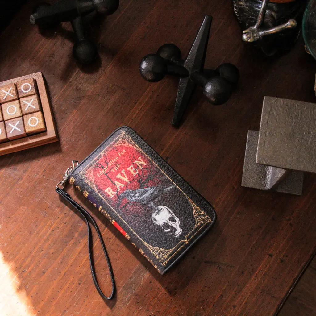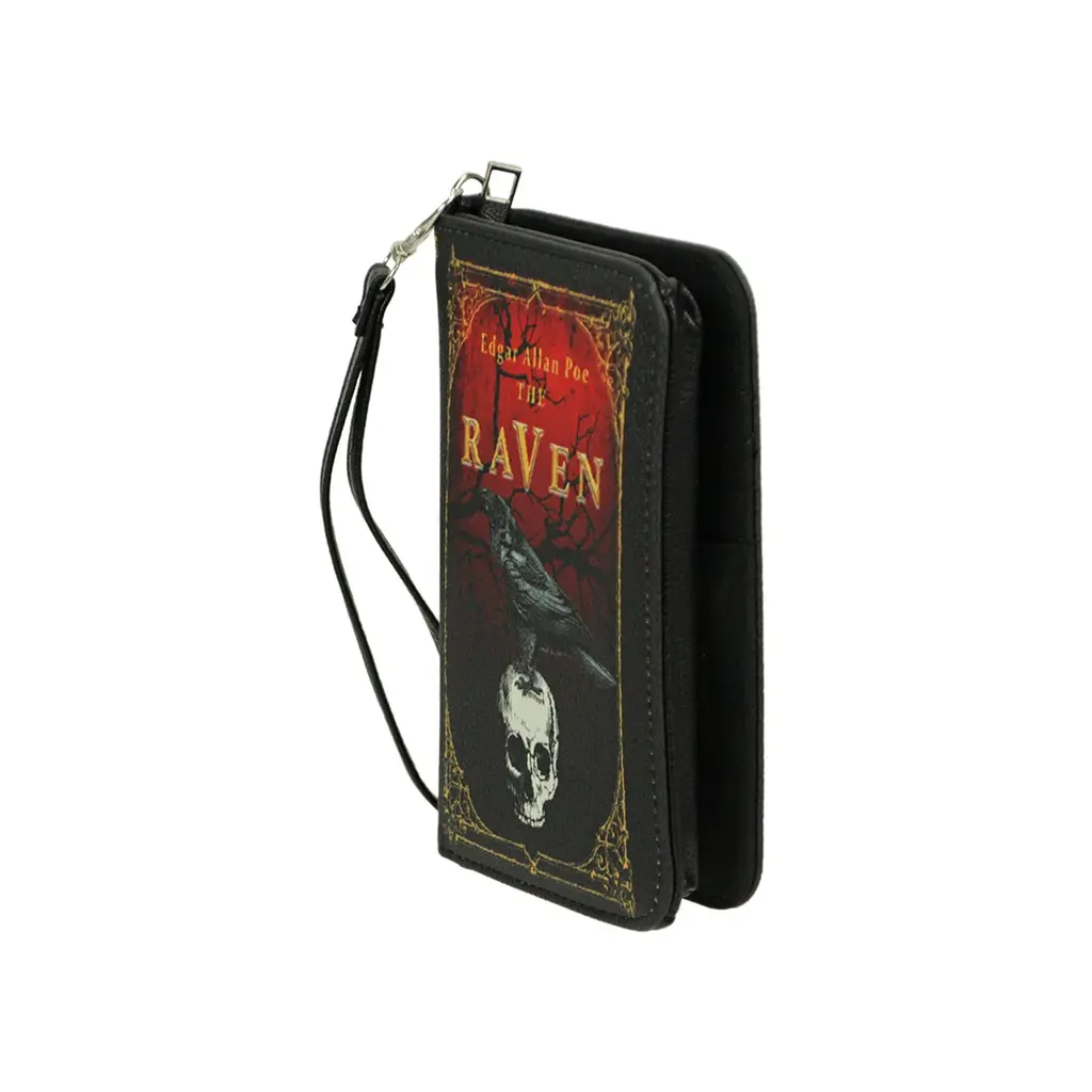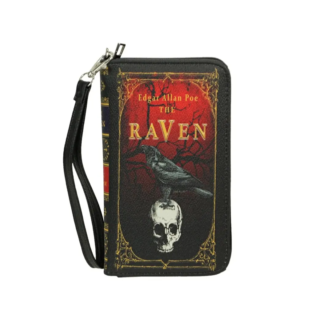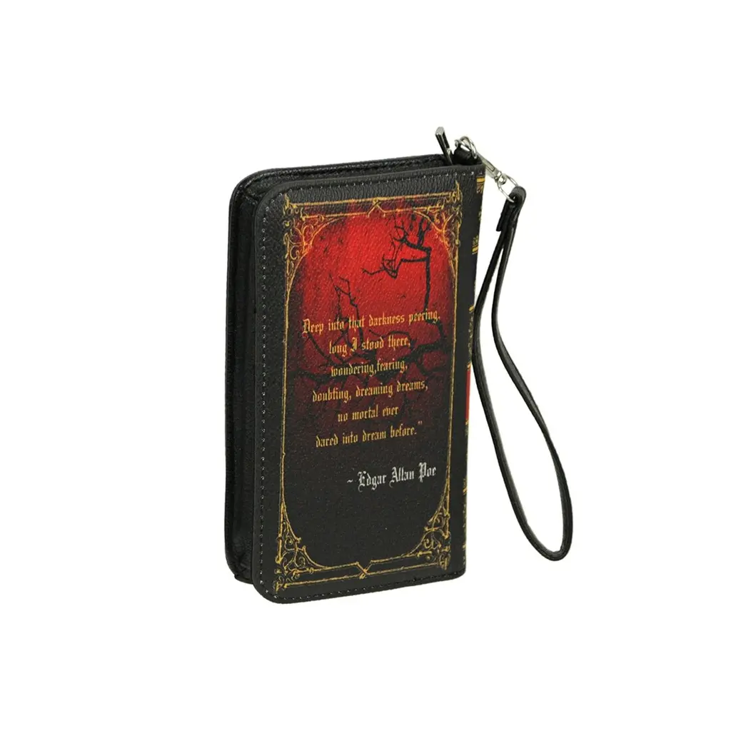Brighten up any midnight dreary with this awesome The Raven book novelty wallet. Made from black vinyl for a faux leather look, this clutch wrist wallet looks like a leather-bound copy of Poe's classic tale and has a short quote from the poem on the back. A perfect piece for anyone that wants to tout their Gothic side, the snap close and zipper coin pouch keep your things secure. Measuring 7 inches long, 4 inches wide, and 1.25 inches high, this fashionable bag comes with a with a detachable wrist strap and features 4 card slots, a windowed ID slot, multiple bill pockets and a zip closed coin pouch for easy and safe storage.