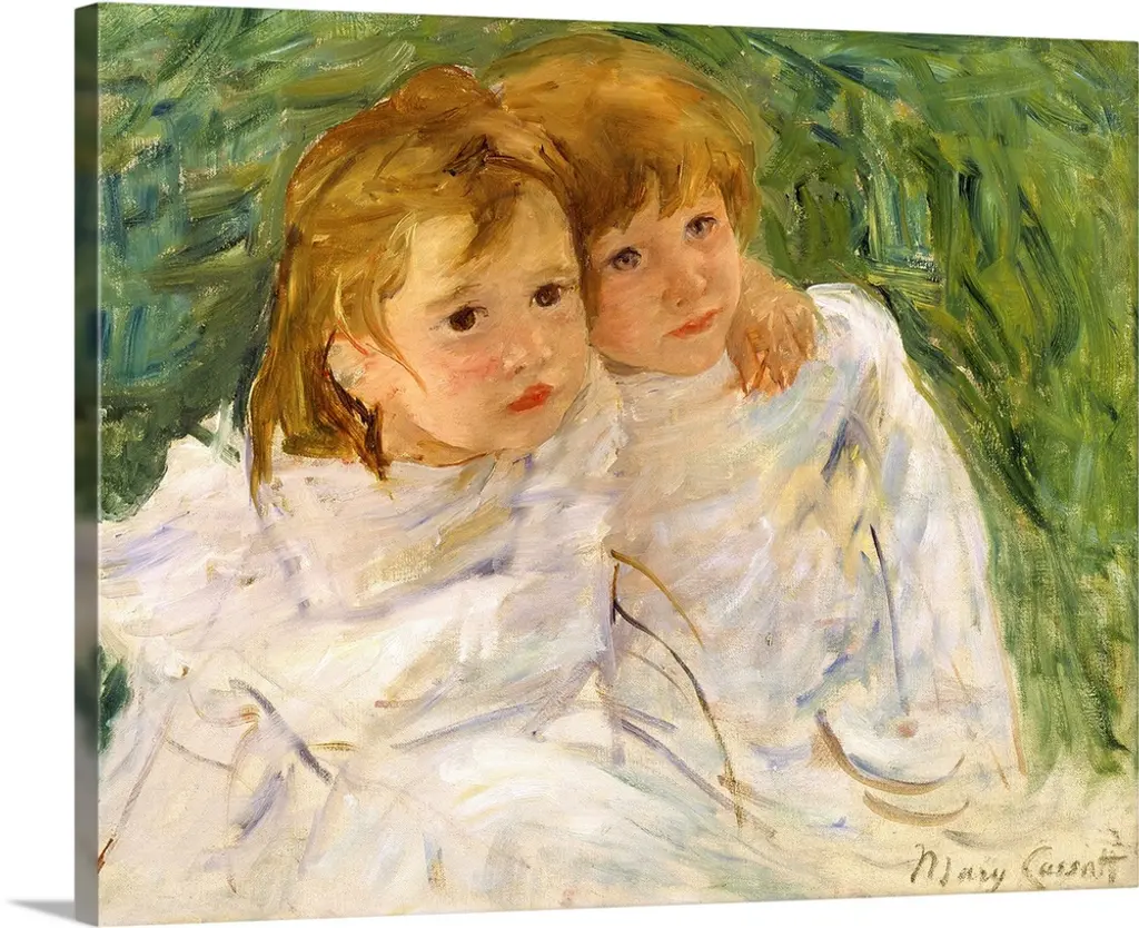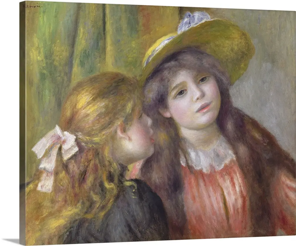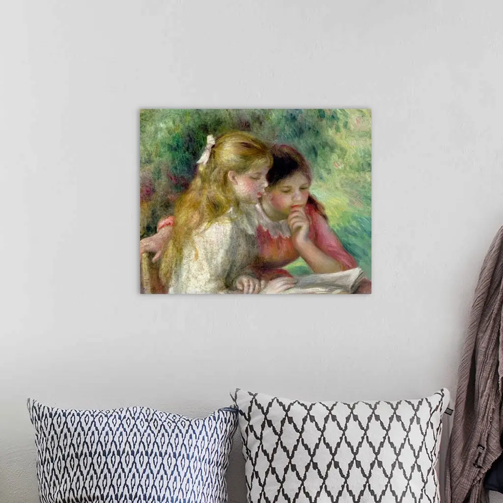 Giant classic art portrays a couple well-dressed young girls studying a book. Artist places the girls in front of a background composed of cool toned brush strokes.