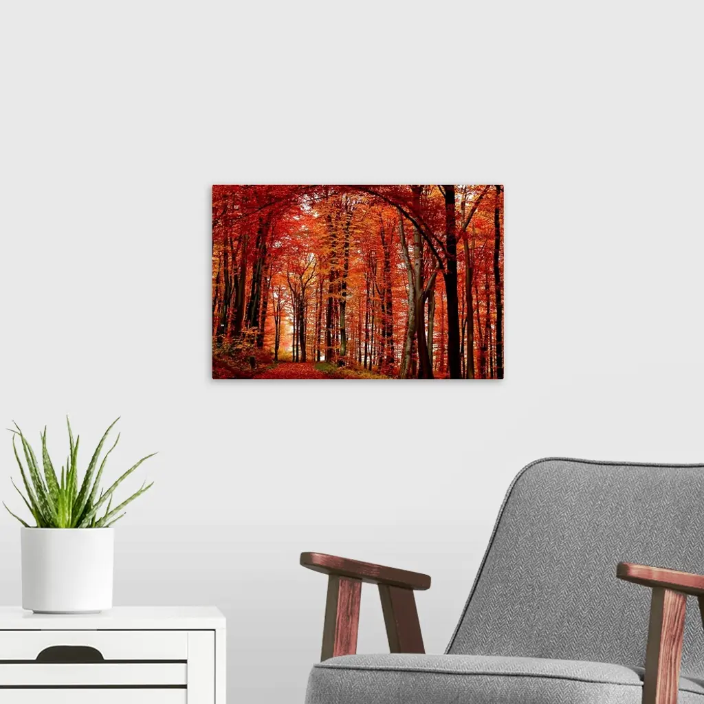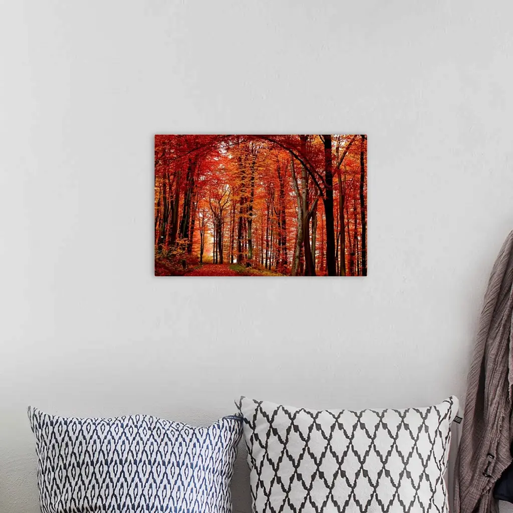 Big canvas art of leaf covered path through a fiery colored forest at autumn.