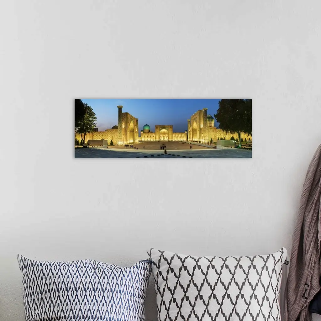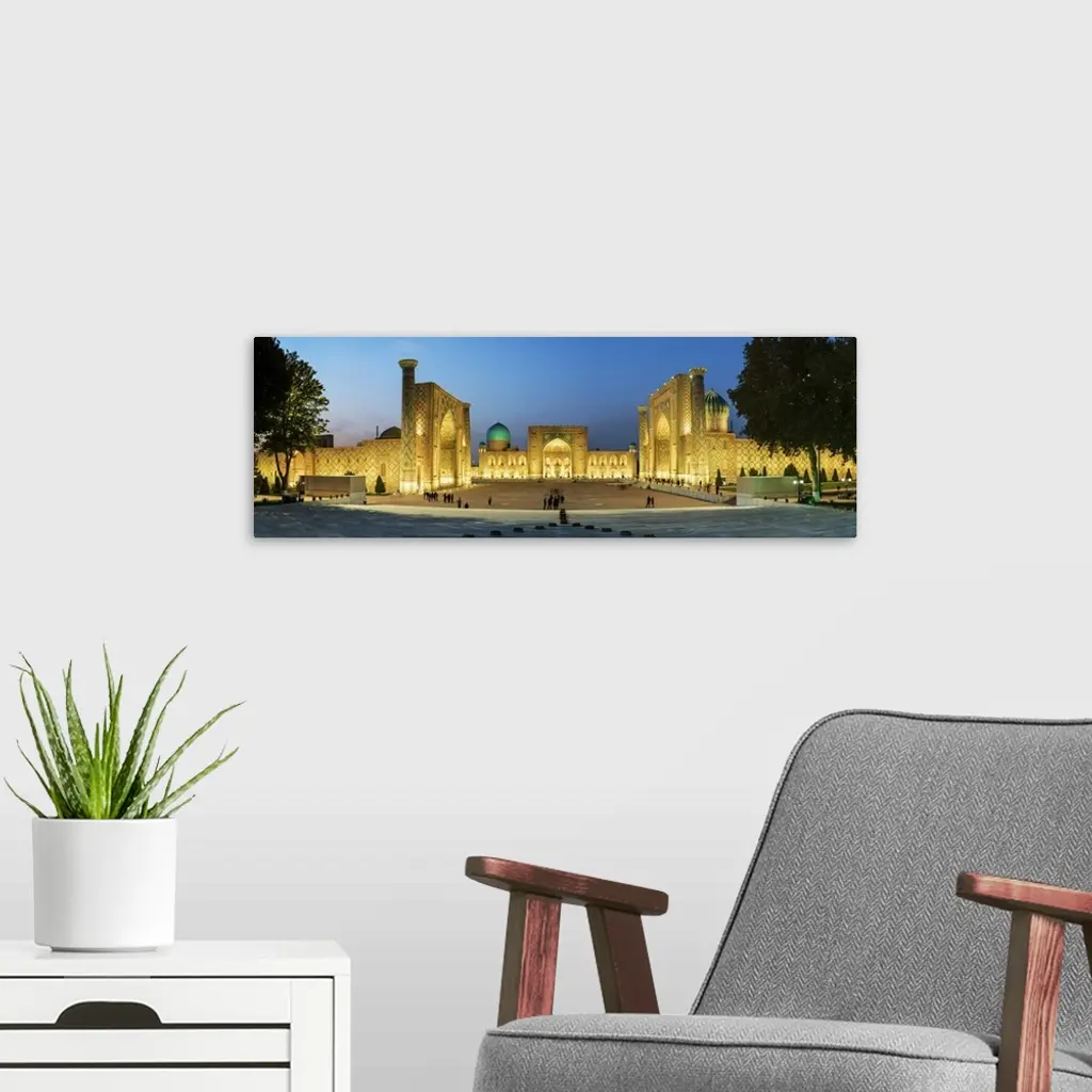 The Registan square and its three madrasahs. From left to right: Ulugh Beg Madrasah, Tilya-Kori Madrasah and Sher-Dor Madrasah. A Unesco World Heritage Site, Samarkand. Uzbekistan