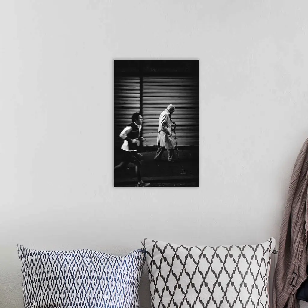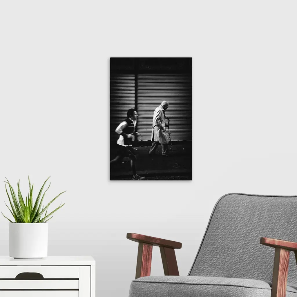 A young man jogs past an elderly man walking with a cane in the city, showing the contrast in their ages.