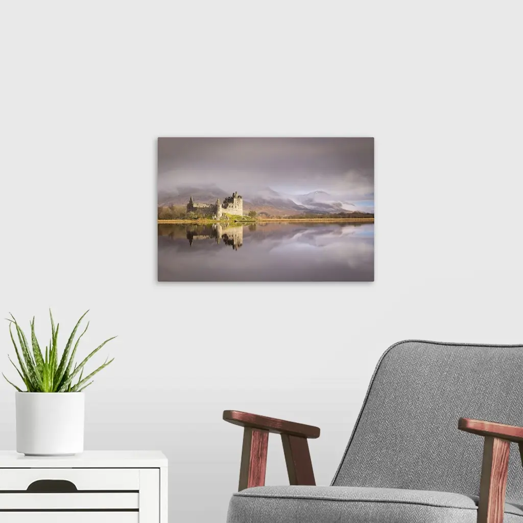 The ruins of Kilchurn Castle reflected in Loch Awe at dawn on a misty morning in the Scottish Highlands, Argyll and Bute, Scotland. Winter (March) 2017.
