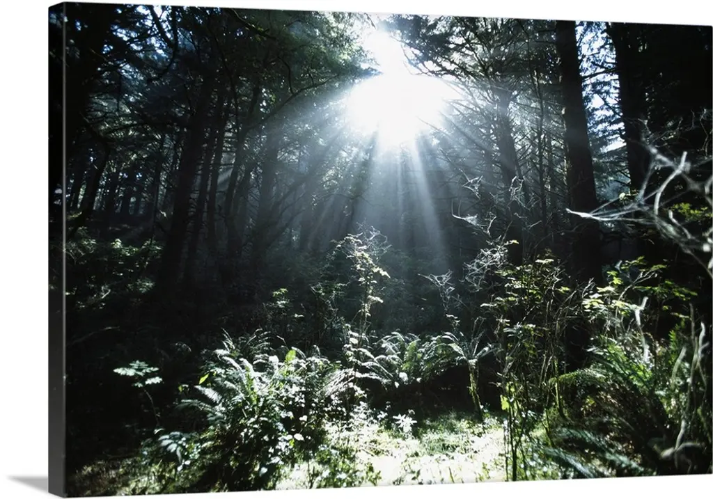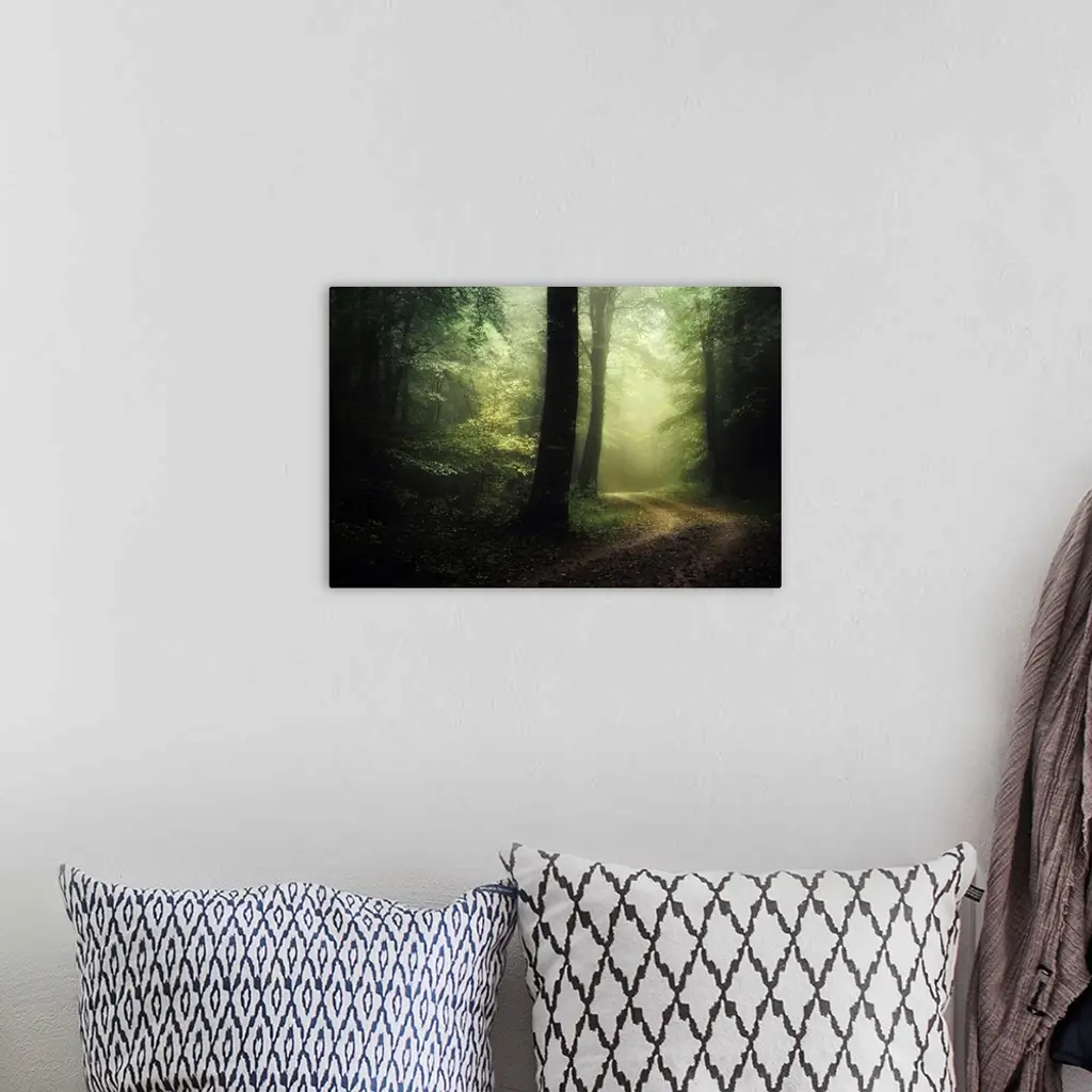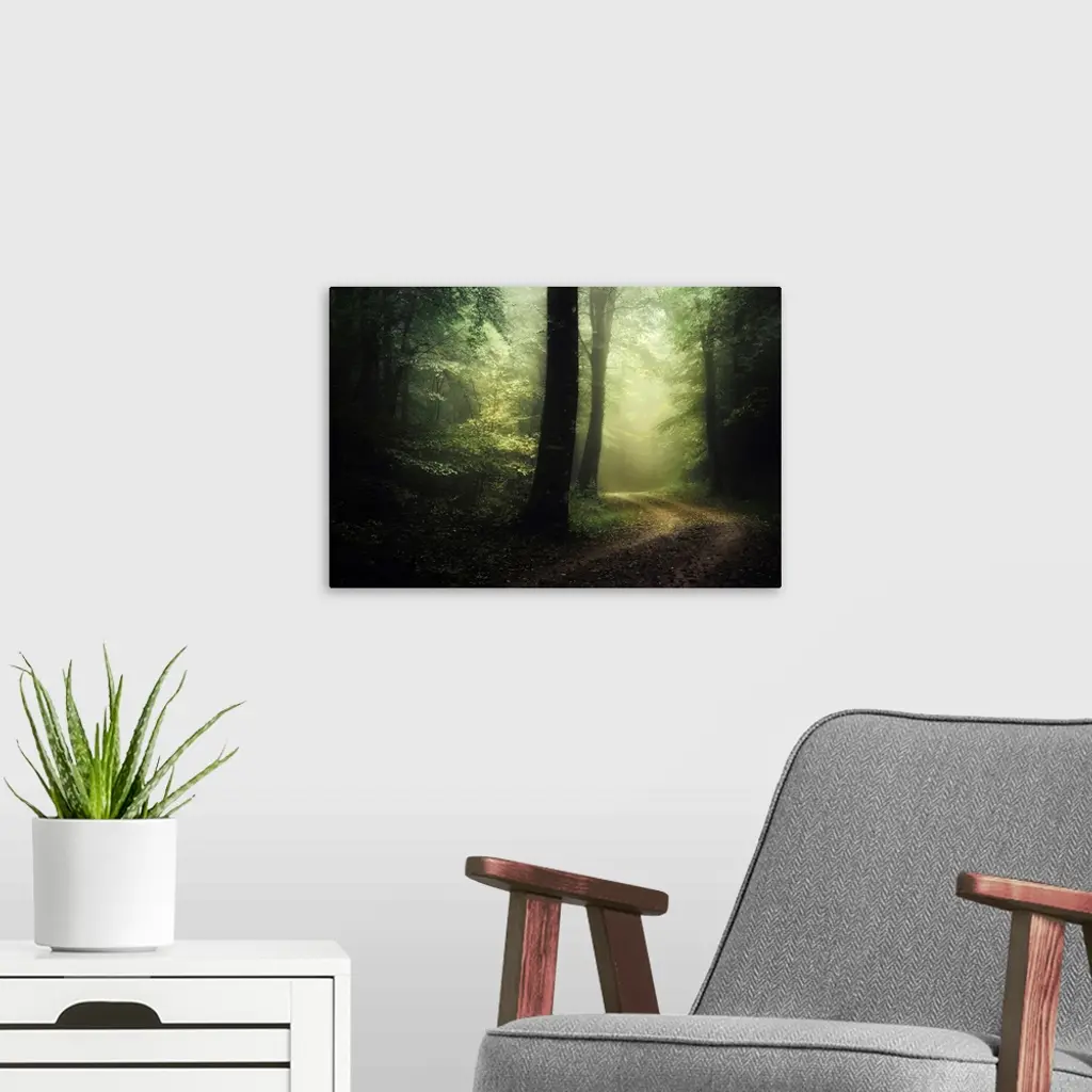 Photograph taken inside a dense forest that has a road cutting through with fog in the distance.