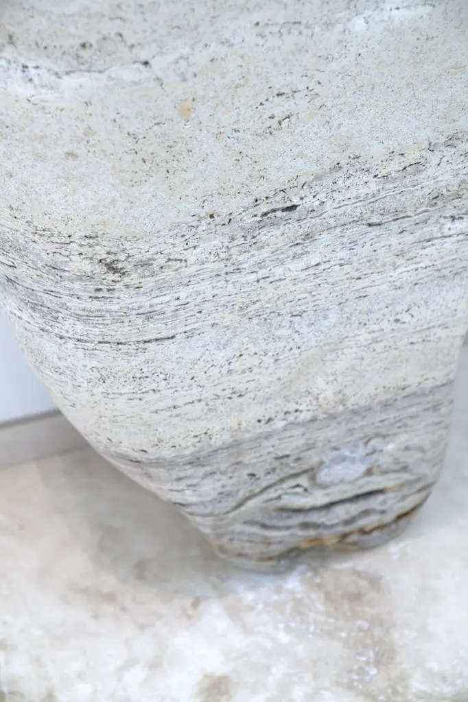 This free-standing vanity designed by L'atelier Arman Safavi an crafted from opulent silver travertine, showcases an exquisite blend of modern sophistication and timeless beauty.The vanity’s fluid lines and sculptural form are meticulously designed to evoke a sense ofserene luxury.Limited edition of two.