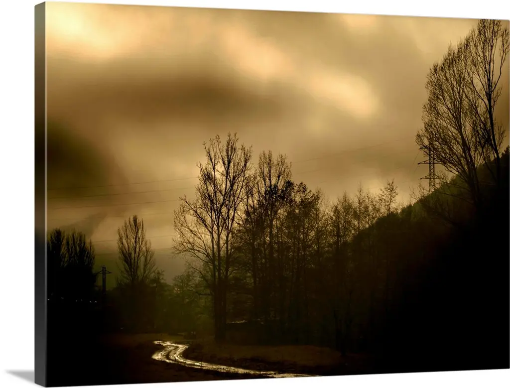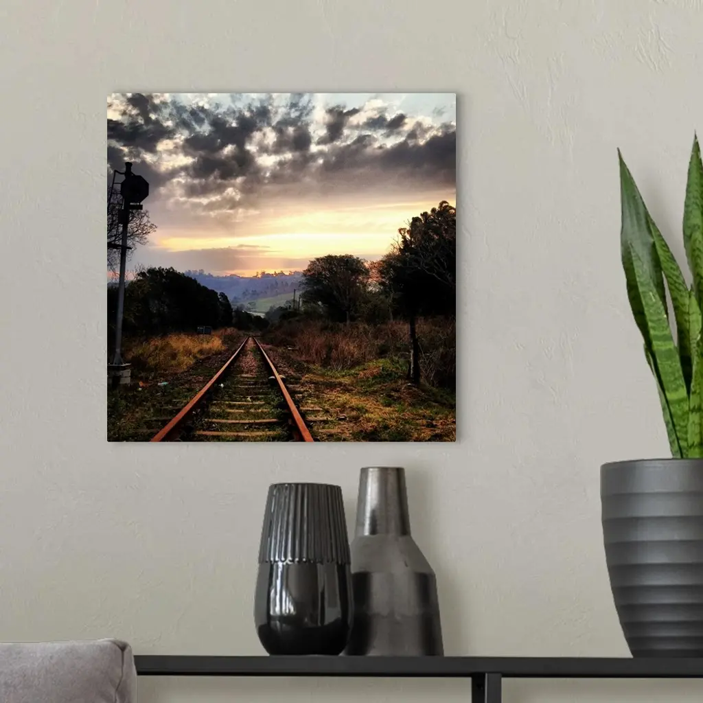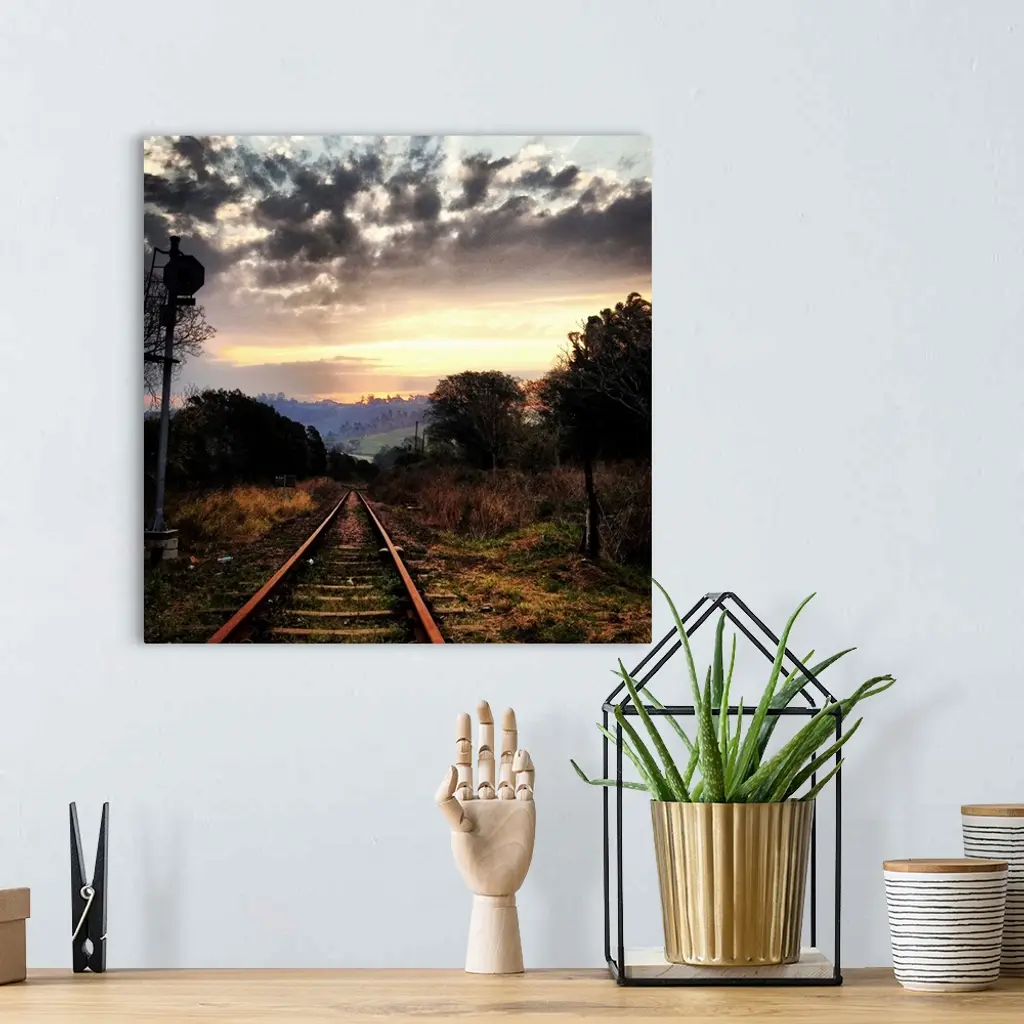 Railway line leading into the setting sun, beautiful dramatic sky.