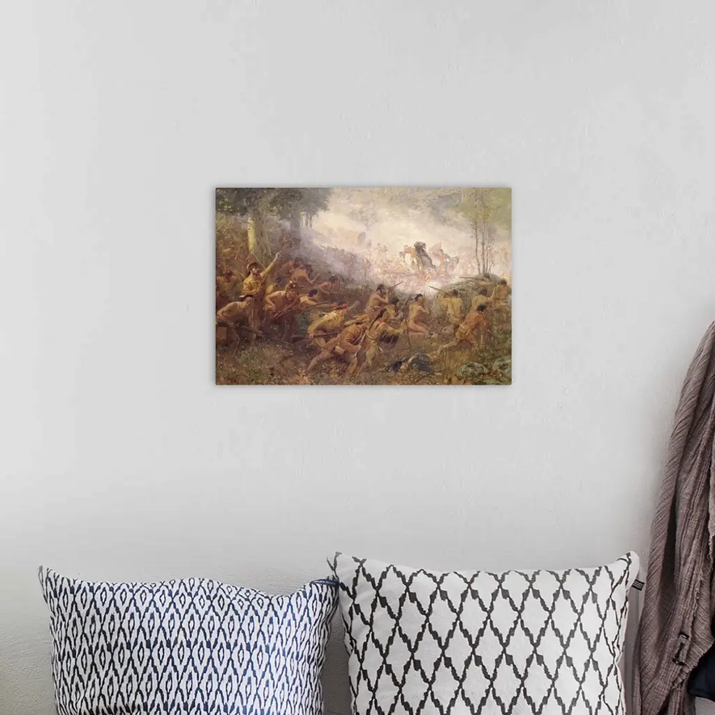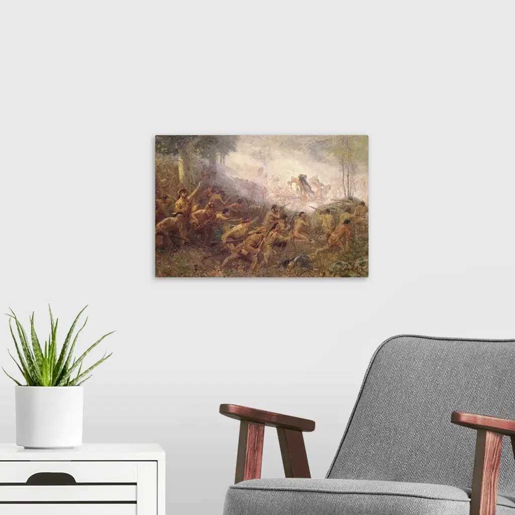 XTD75445 The Shooting of General Braddock at Fort Duquesne, Pittsburgh, 1755 (oil on canvas) by Deming, Edwin Willard (1860-1942); State Historical Society of Wisconsin, Madison, USA; (add. info.: French and Indian troops ambush; two-thirds of 1200 strong British force killed or wounded; General Edward Braddock (1695-1755)); American, out of copyright