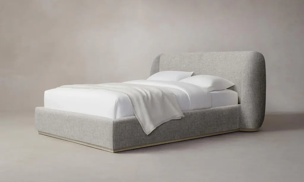 With its voluminous form and sweeping curves, the Smith Bed is a statement piece for the bedroom. Its enveloping shelter headboard and frame are fully upholstered and set upon a plinth base. Handcrafted in North Carolina.