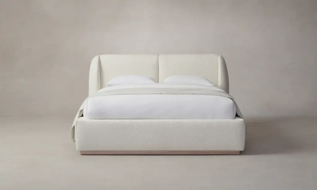With its voluminous form and sweeping curves, the Smith Bed is a statement piece for the bedroom. Its enveloping shelter headboard and frame are fully upholstered and set upon a plinth base. Handcrafted in North Carolina.