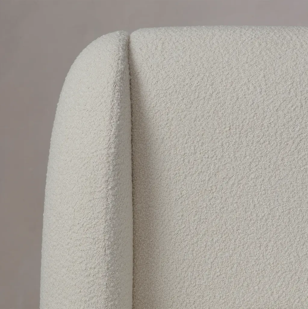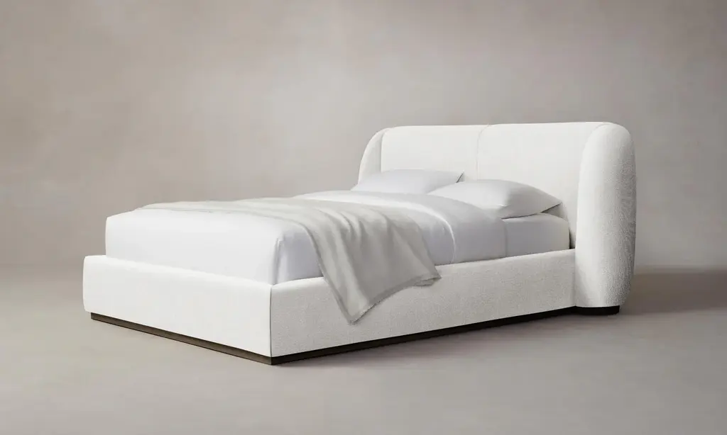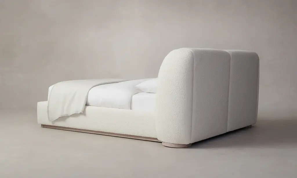 With its voluminous form and sweeping curves, the Smith Bed is a statement piece for the bedroom. Its enveloping shelter headboard and frame are fully upholstered and set upon a plinth base. Handcrafted in North Carolina.