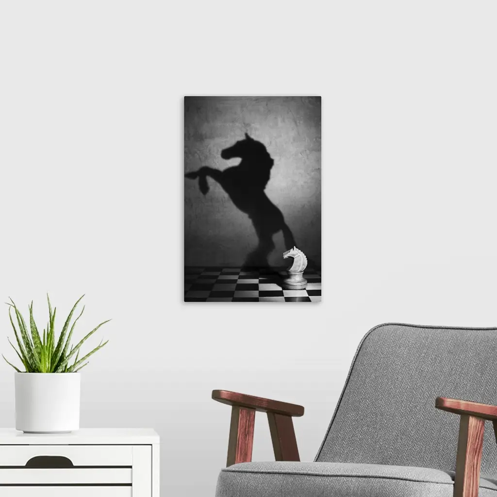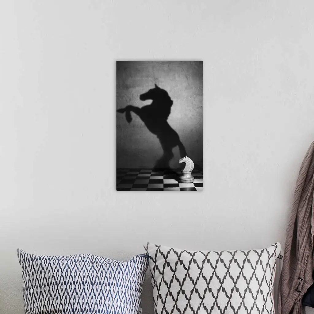 A knight chess piece cast the shadow of a rearing horse onto the wall.