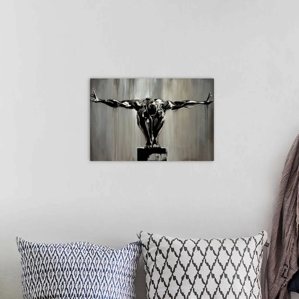 Oversized, landscape, figurative art of a muscular man, squatting down with his head between his knees, arms outstretched. Drips from his arms give the appearance of running paint or ink.