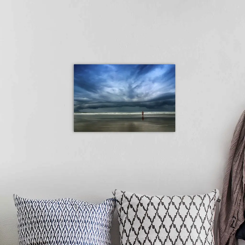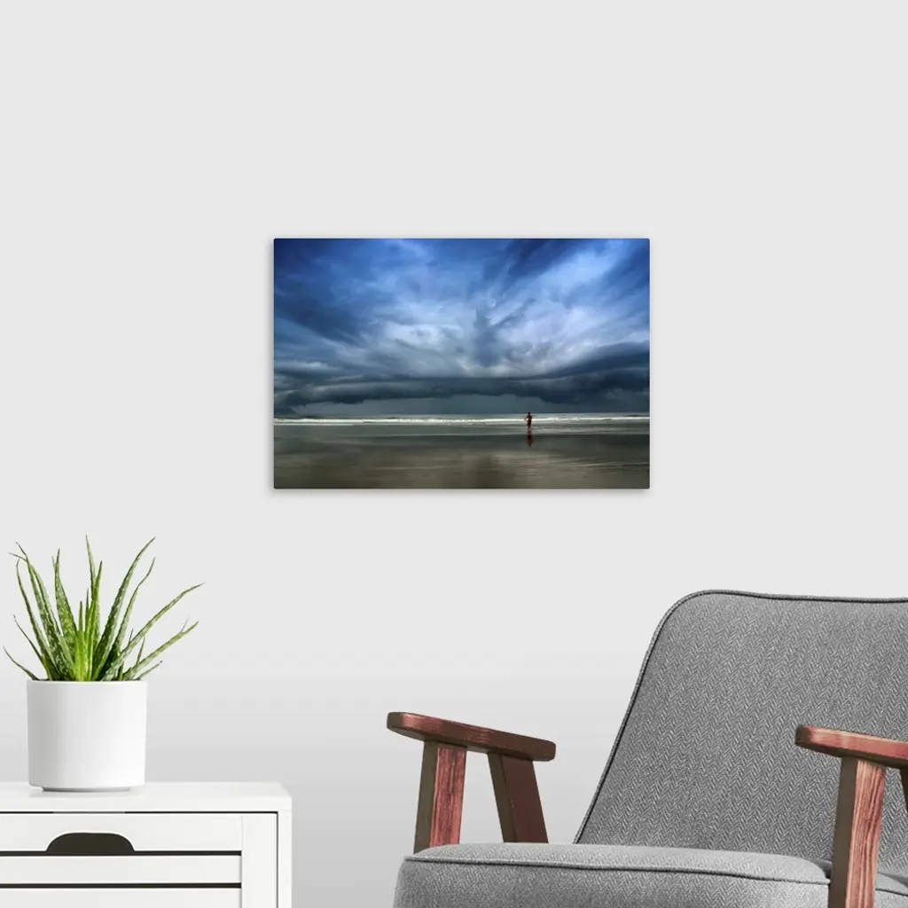 Adventurous surfer heads into the water, undeterred by the approaching stormclouds.