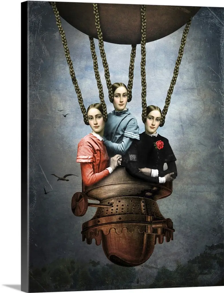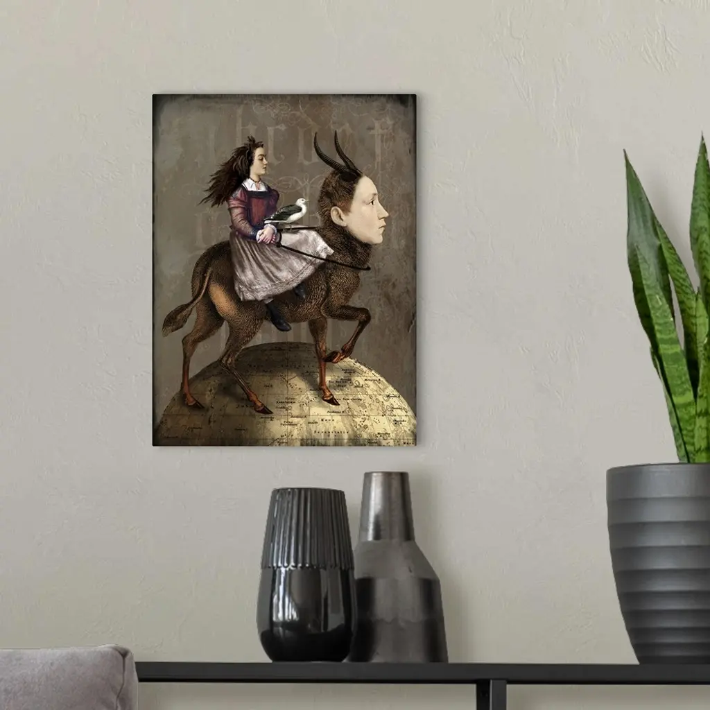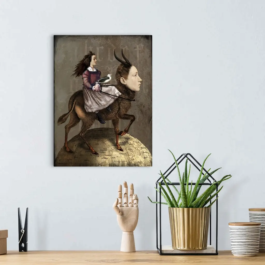 A lady with a bird is riding a mythical creature of half man, half deer. They are standing on a globe with a textured, weathered background.