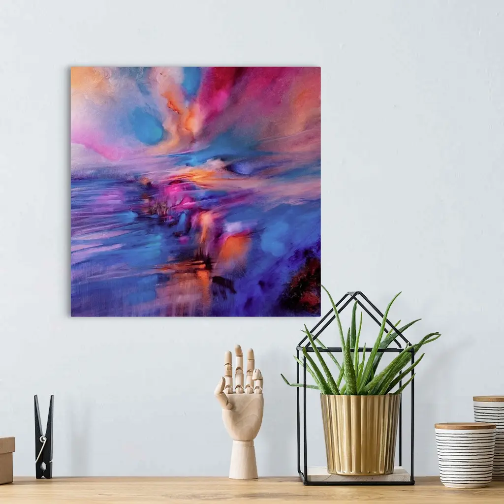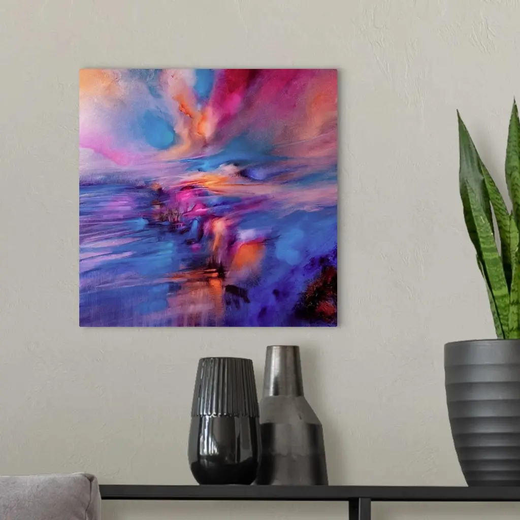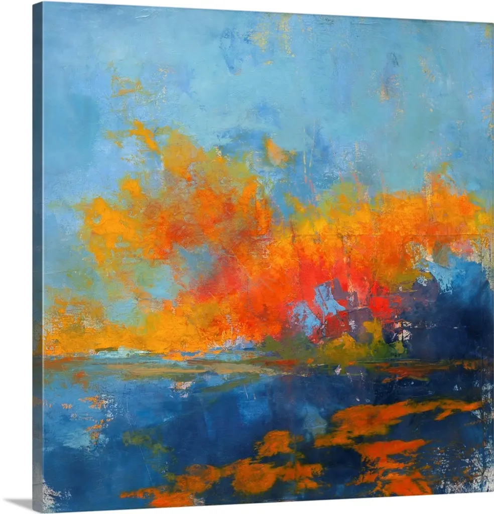 Abstract painted landscape with vivid structures. Wide horizon, clouds, bright light, a river with coastlines that are reflected in the water. Intense blue, orange and red