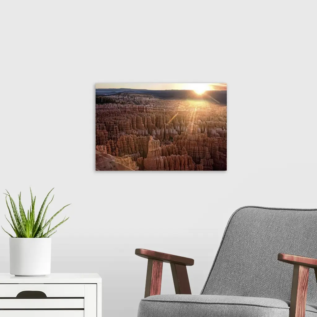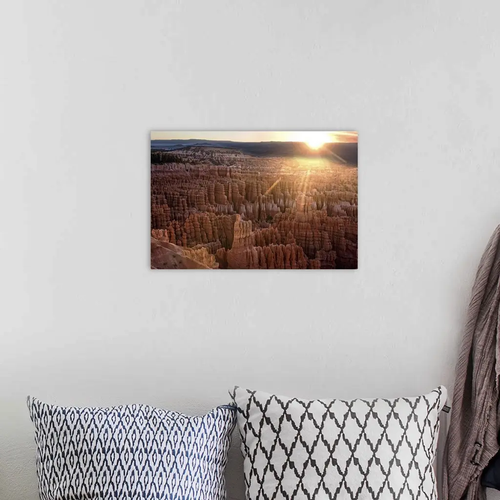 The Sun On The Horizon Shining On The Hoodoos In Bryce Canyon Amphitheater, Utah