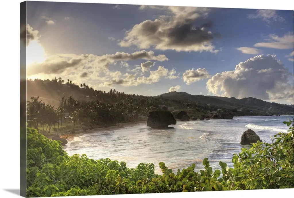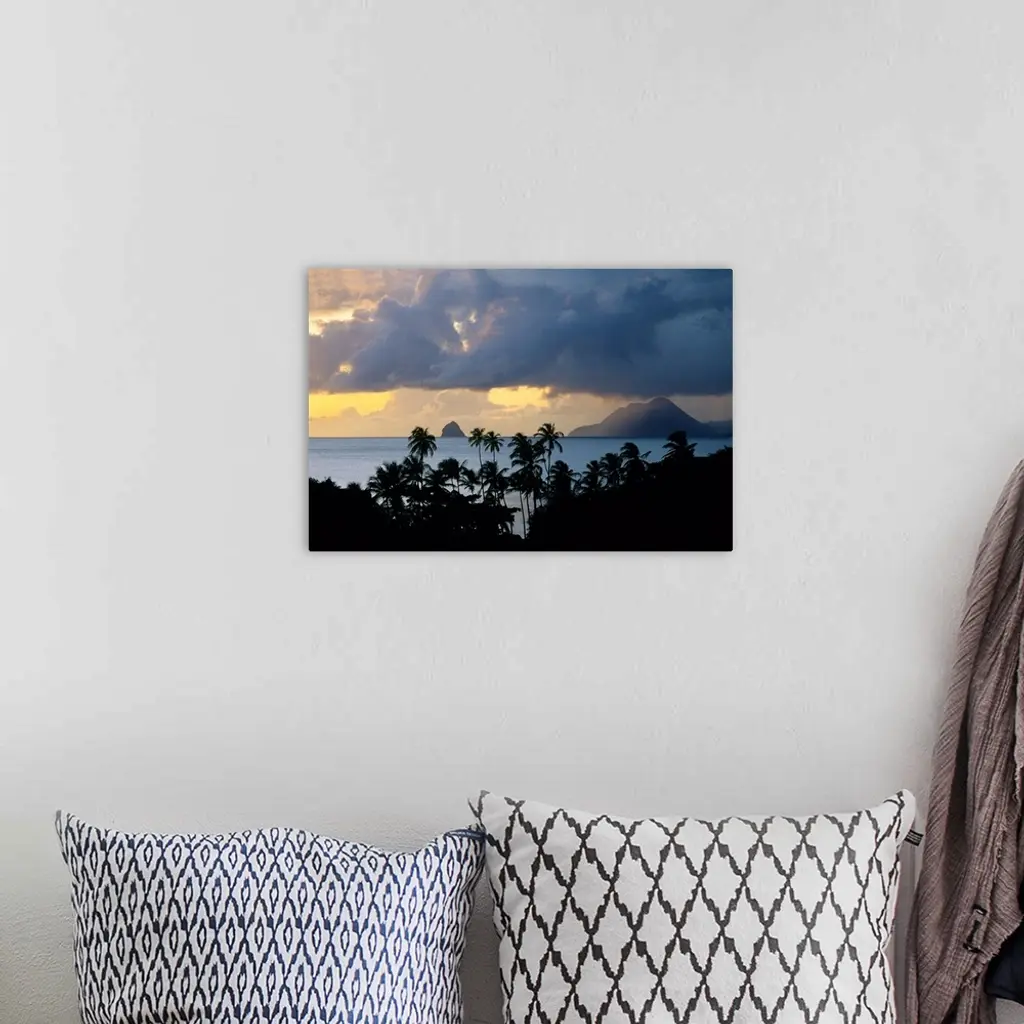 The sun sets behind Diamond Rock viewed from the island of Martinique in the Caribbean Sea.