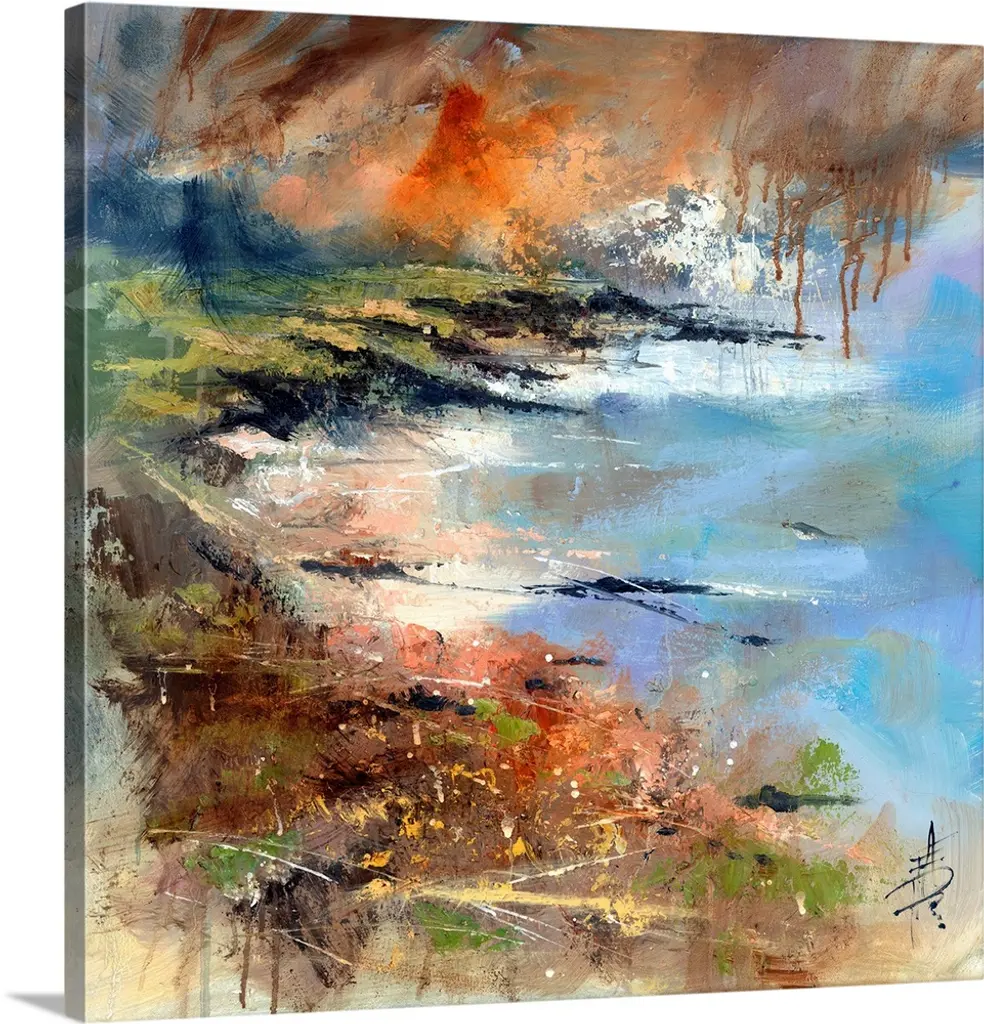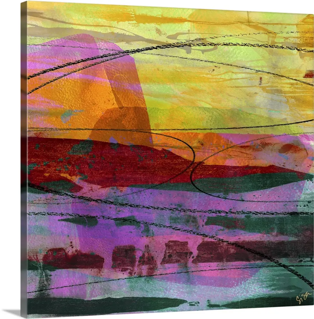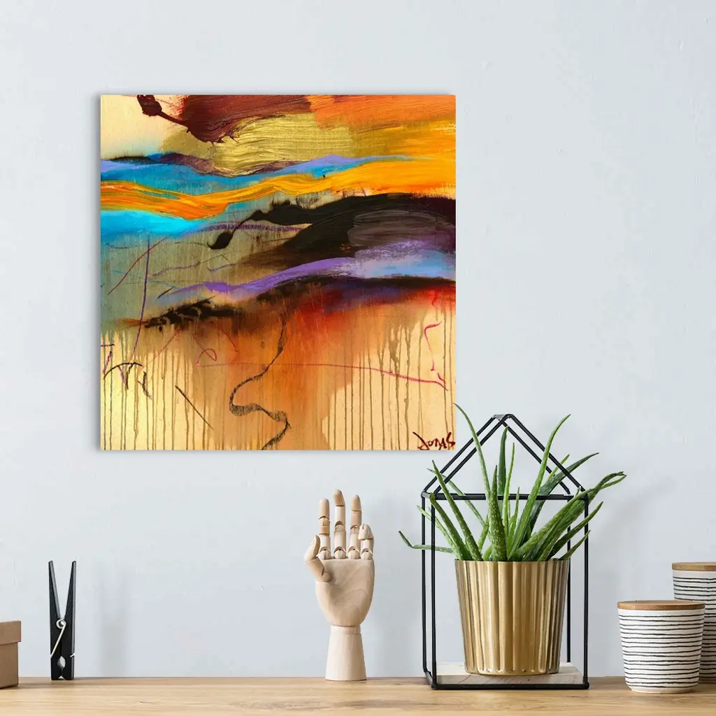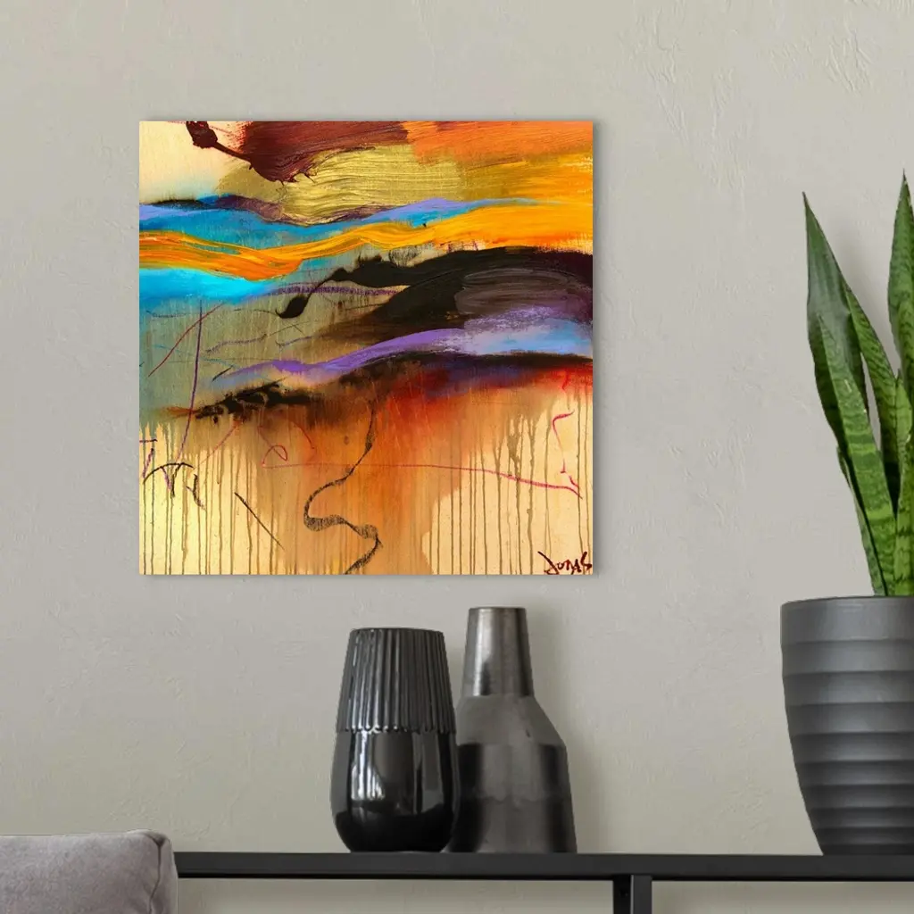 Giant, square contemporary art of large, thick brush strokes in a variety of colors that extend horizontally across the top half of the image. The bottom half appears to have running or dripping paint.