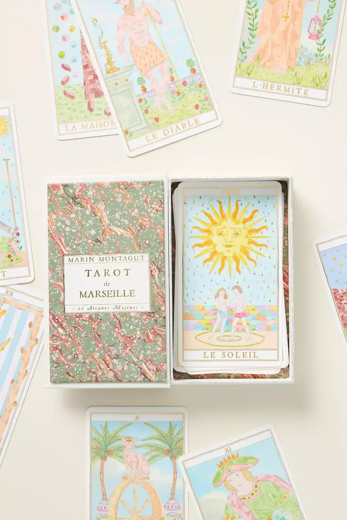 Fascinated by fortune telling, Marin Montagut spent two years in his Normandy workshop creating a whimsical divinatory Tarot card game, handpainted in watercolor and inspired by 19th-century engravings.