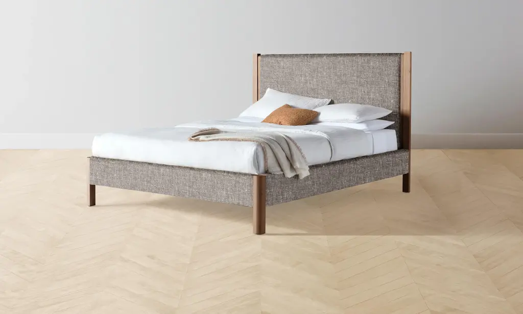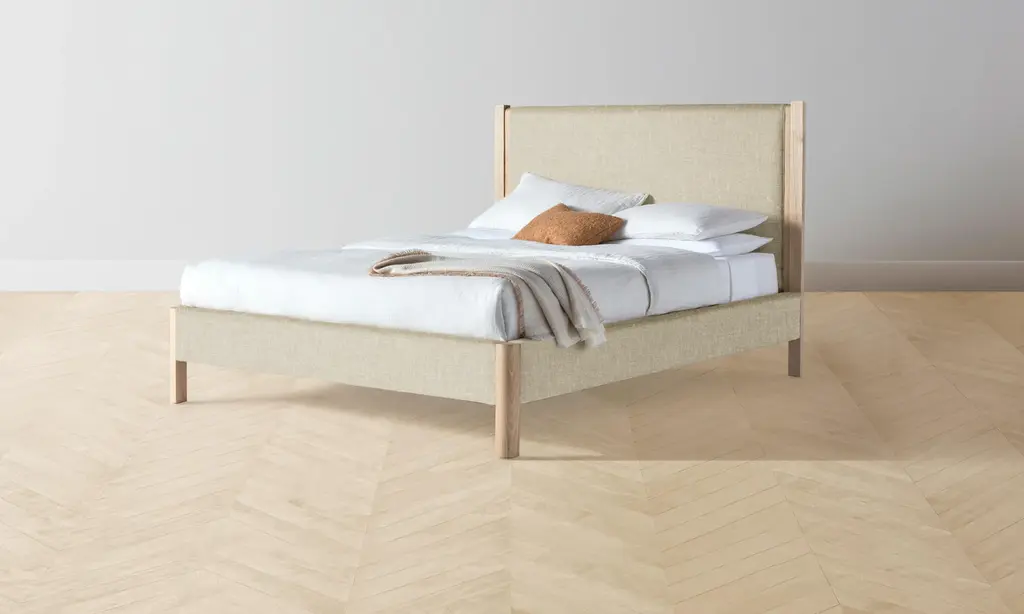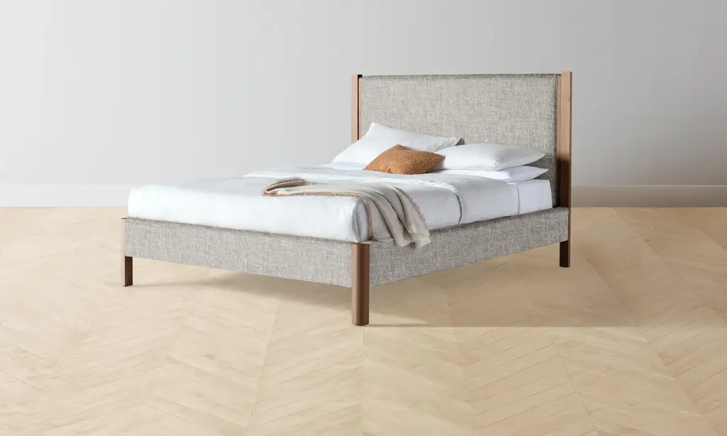 The Thompson Bed is an expression of graceful simplicity. It has an ash frame with rounded corners and neat upholstery along the headboard, foot rail, and sides, creating a perfect balance of rigidity and softness. Handcrafted in North Carolina.