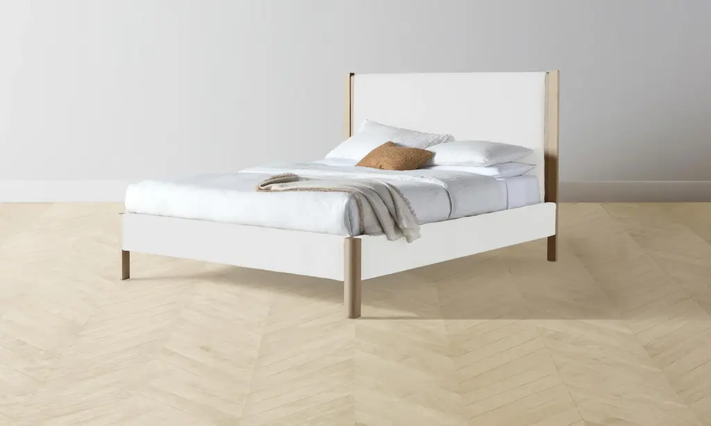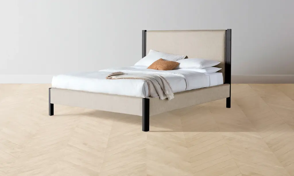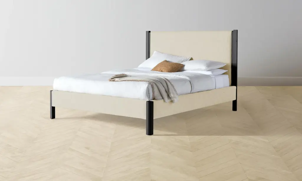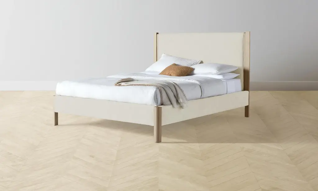 The Thompson Bed is an expression of graceful simplicity. It has an ash frame with rounded corners and neat upholstery along the headboard, foot rail, and sides, creating a perfect balance of rigidity and softness. Handcrafted in North Carolina.