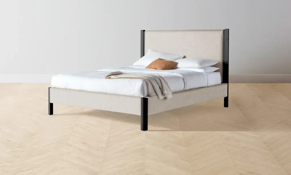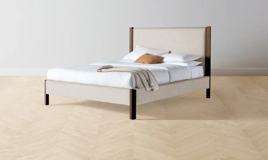 The Thompson Bed is an expression of graceful simplicity. It has an ash frame with rounded corners and neat upholstery along the headboard, foot rail, and sides, creating a perfect balance of rigidity and softness. Handcrafted in North Carolina.