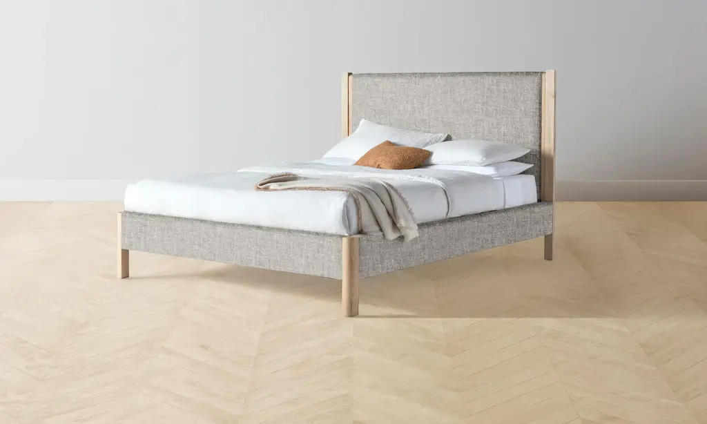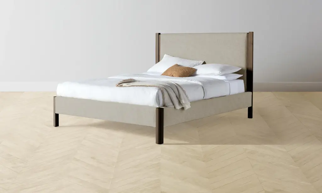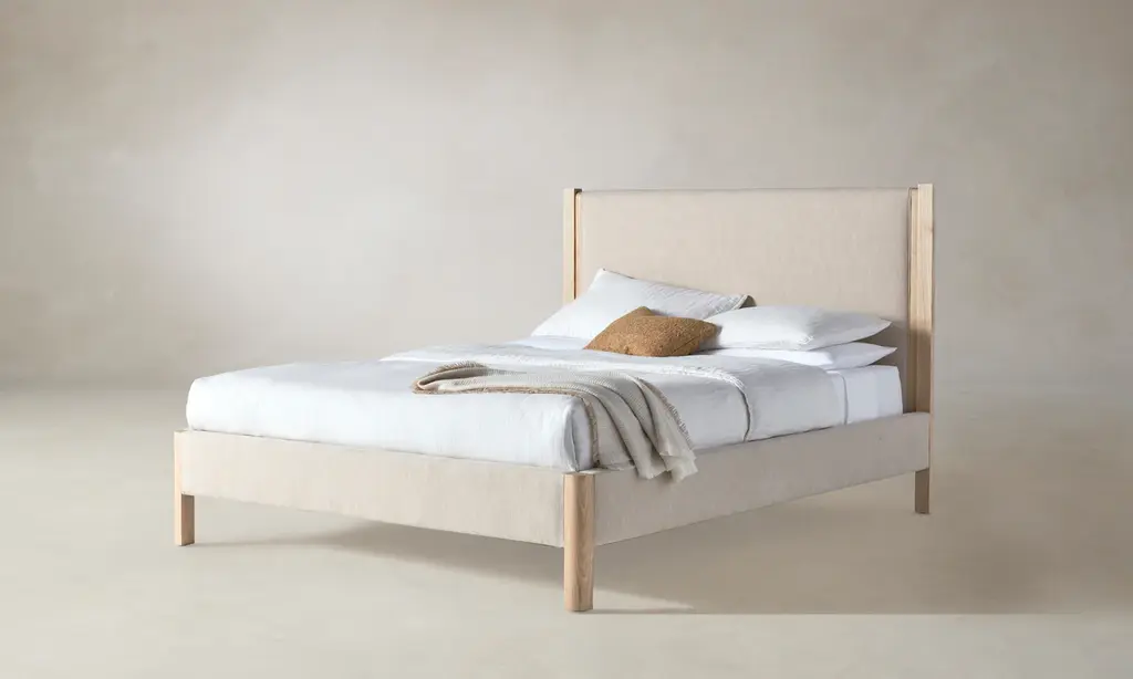 The Thompson Bed is an expression of graceful simplicity. It has an ash frame with rounded corners and neat upholstery along the headboard, foot rail, and sides, creating a perfect balance of rigidity and softness. Handcrafted in North Carolina.