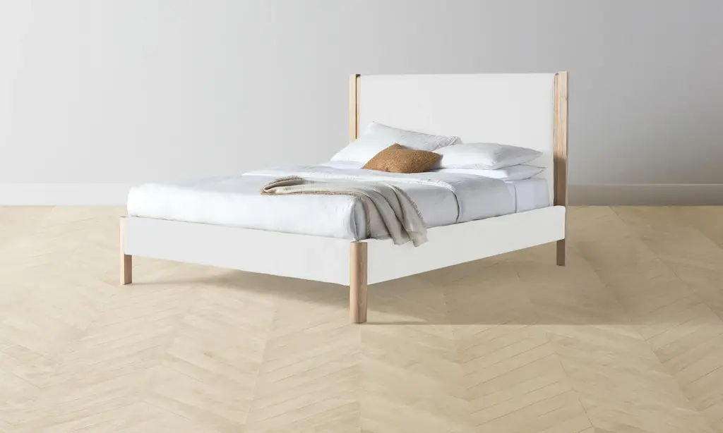 The Thompson Bed is an expression of graceful simplicity. It has an ash frame with rounded corners and neat upholstery along the headboard, foot rail, and sides, creating a perfect balance of rigidity and softness. Handcrafted in North Carolina.