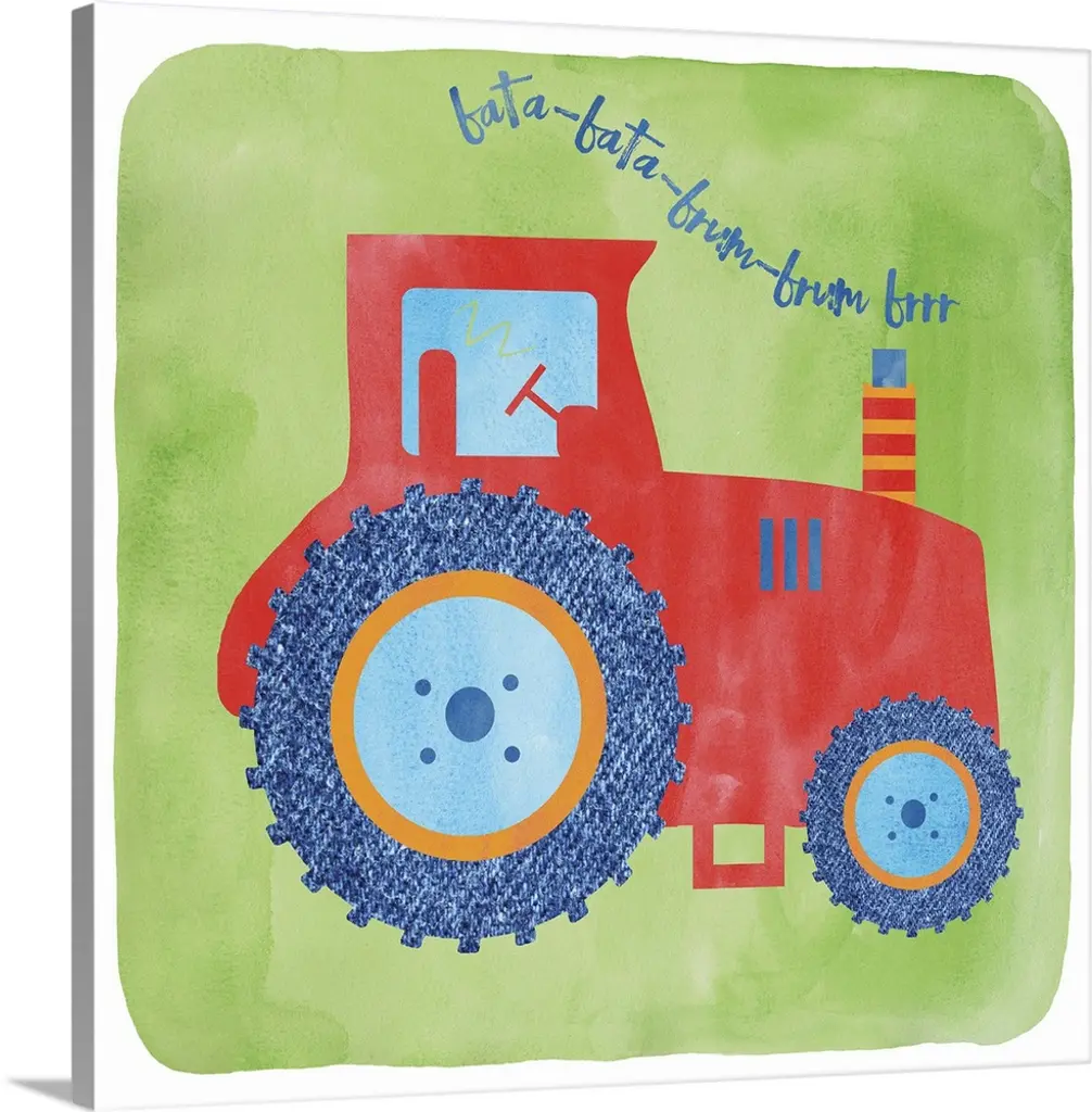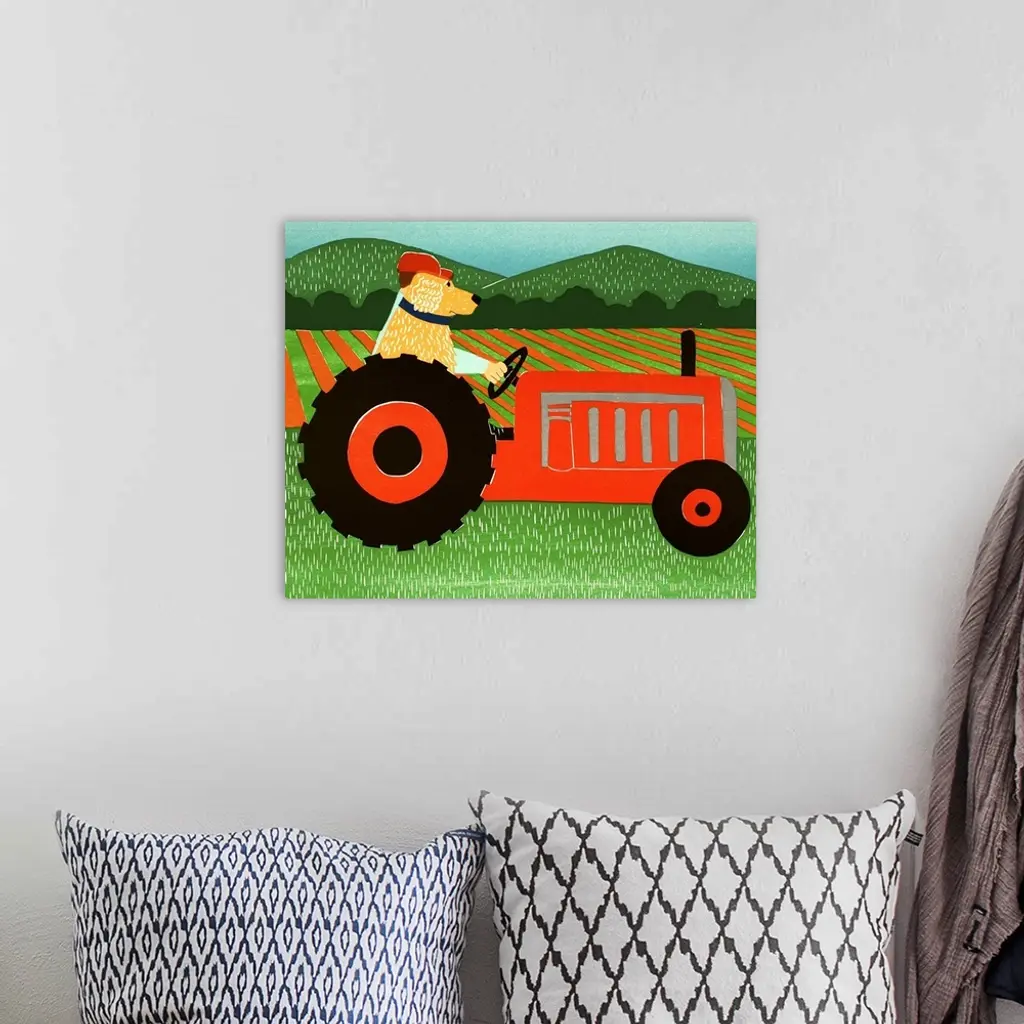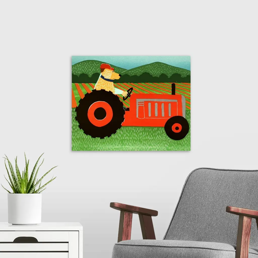 Illustration of a yellow lab riding on a red tractor with its owner.