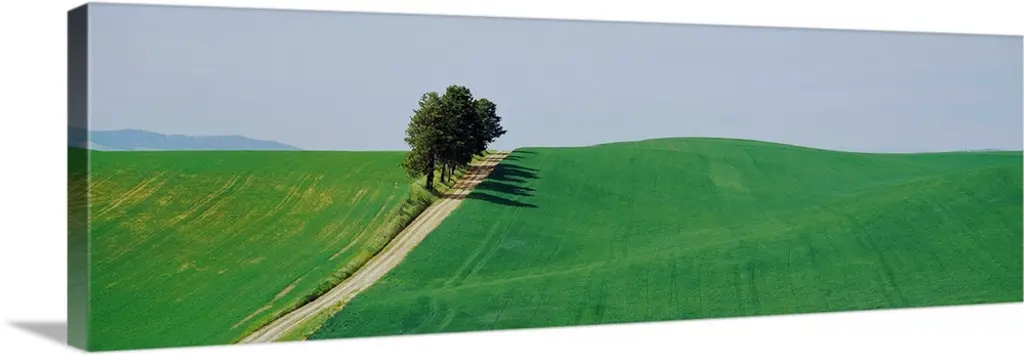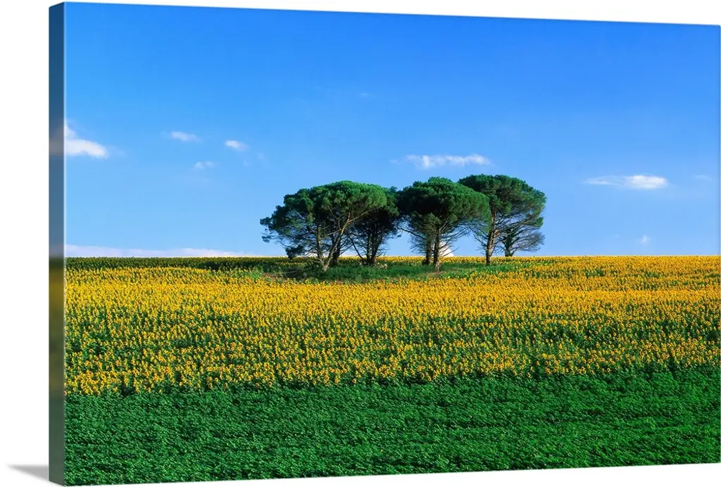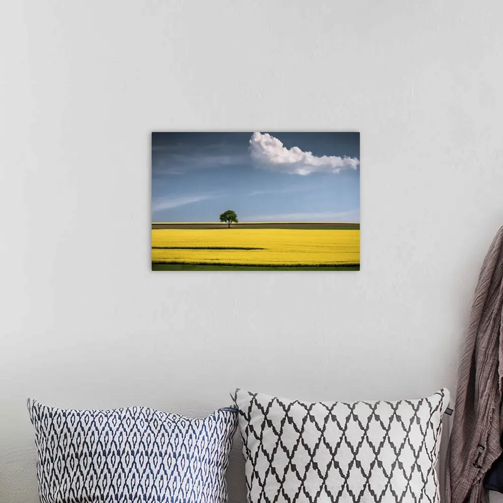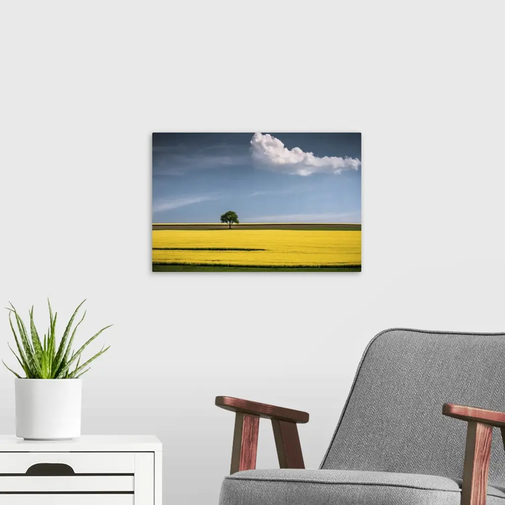 A tree in the center of a bright yellow canola field with a lone cloud floating by.