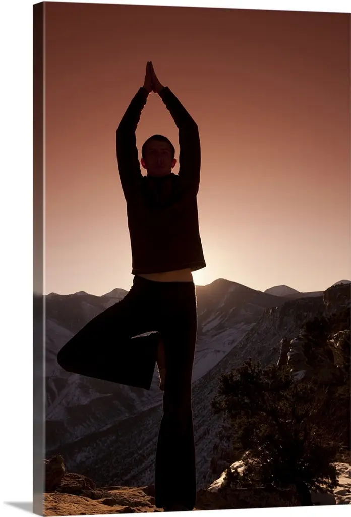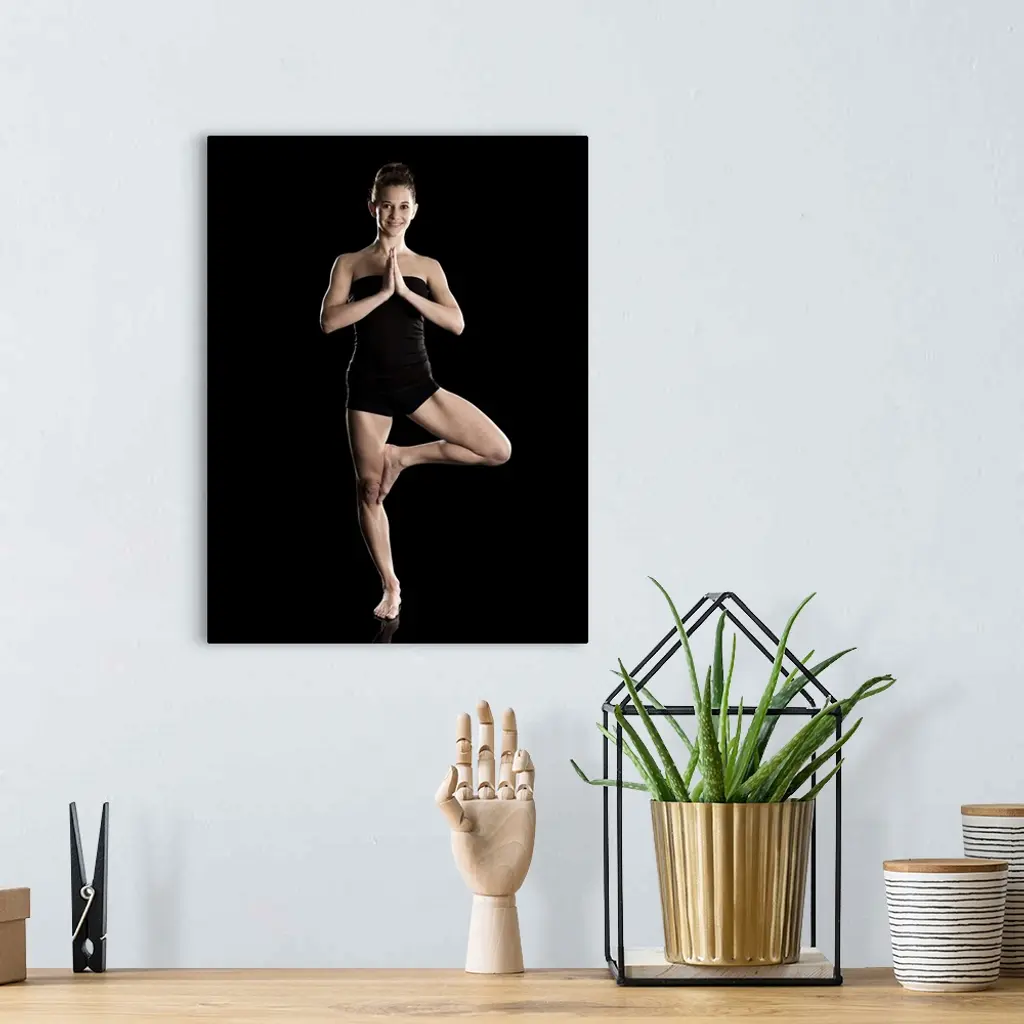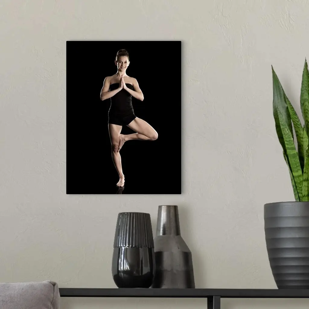 Studio shot of young woman practicing yoga. The tree pose, Vriksasana.