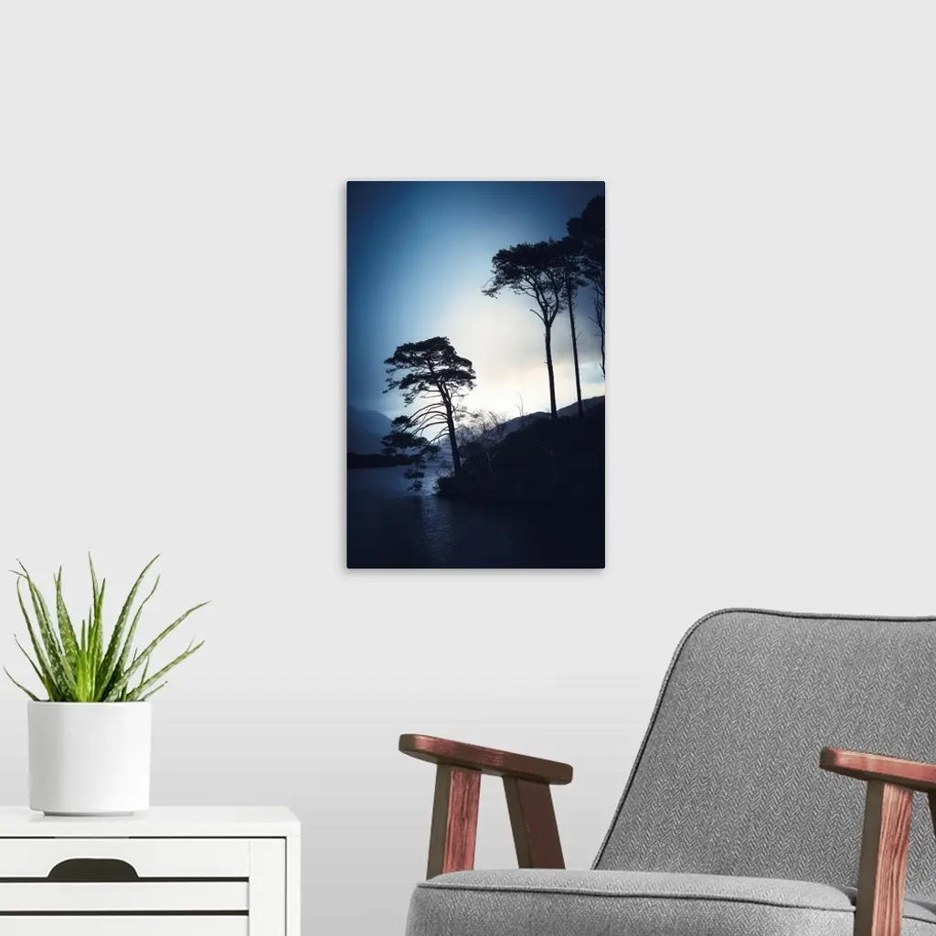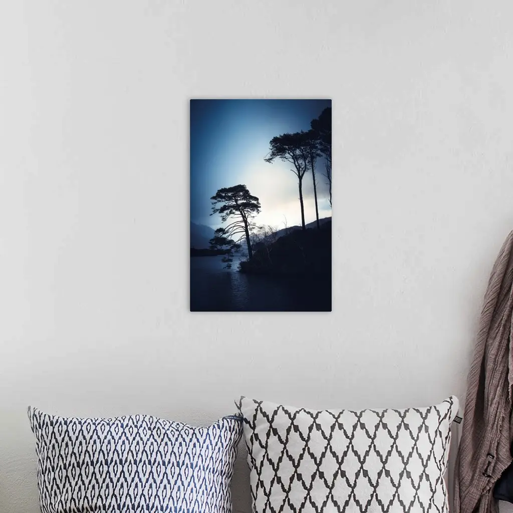 Tree silhouettes alongside a lake in Scotland