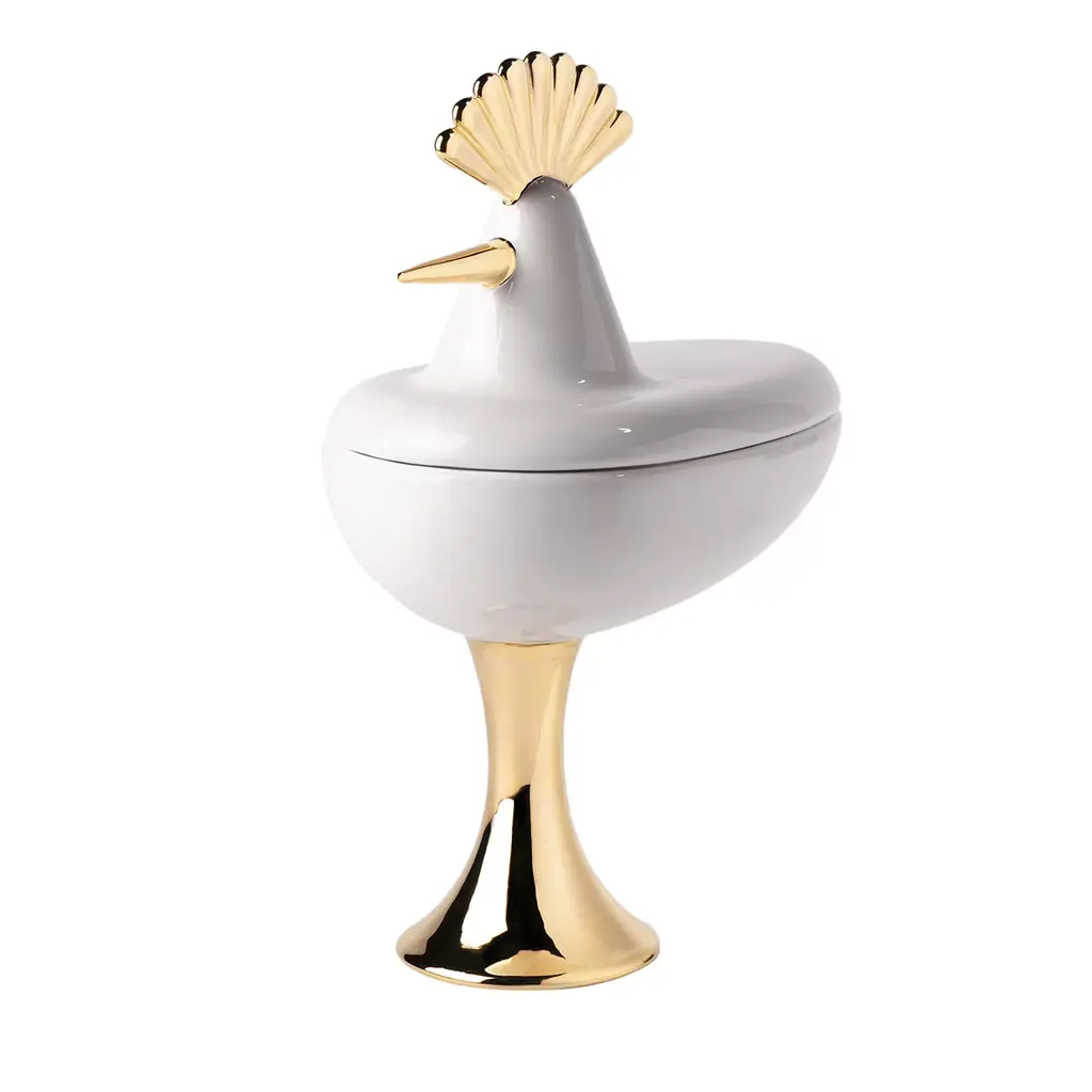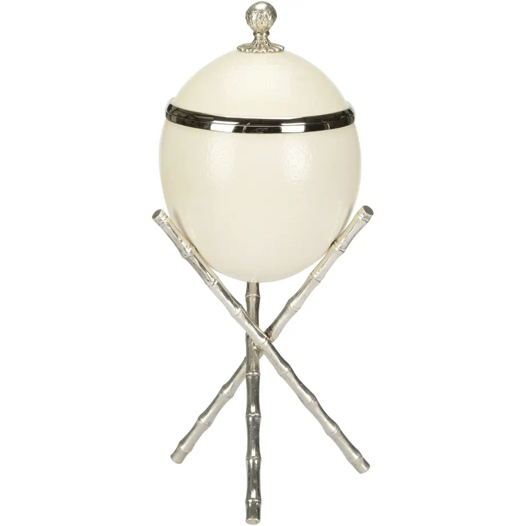 A stunning lacquered ostrich eggshell box with atop a pedestal of silver plated bamboo shaped sticks. A true work of art made with the highest of craftsmanship.