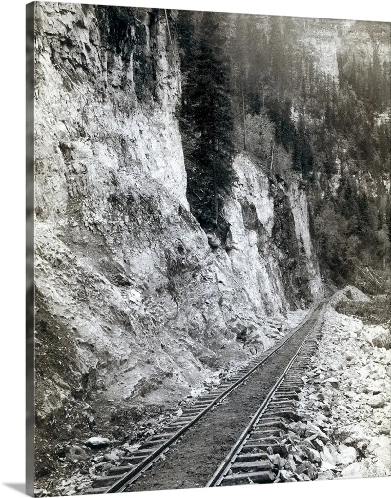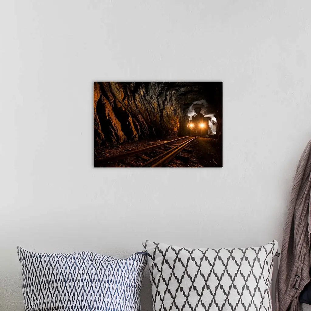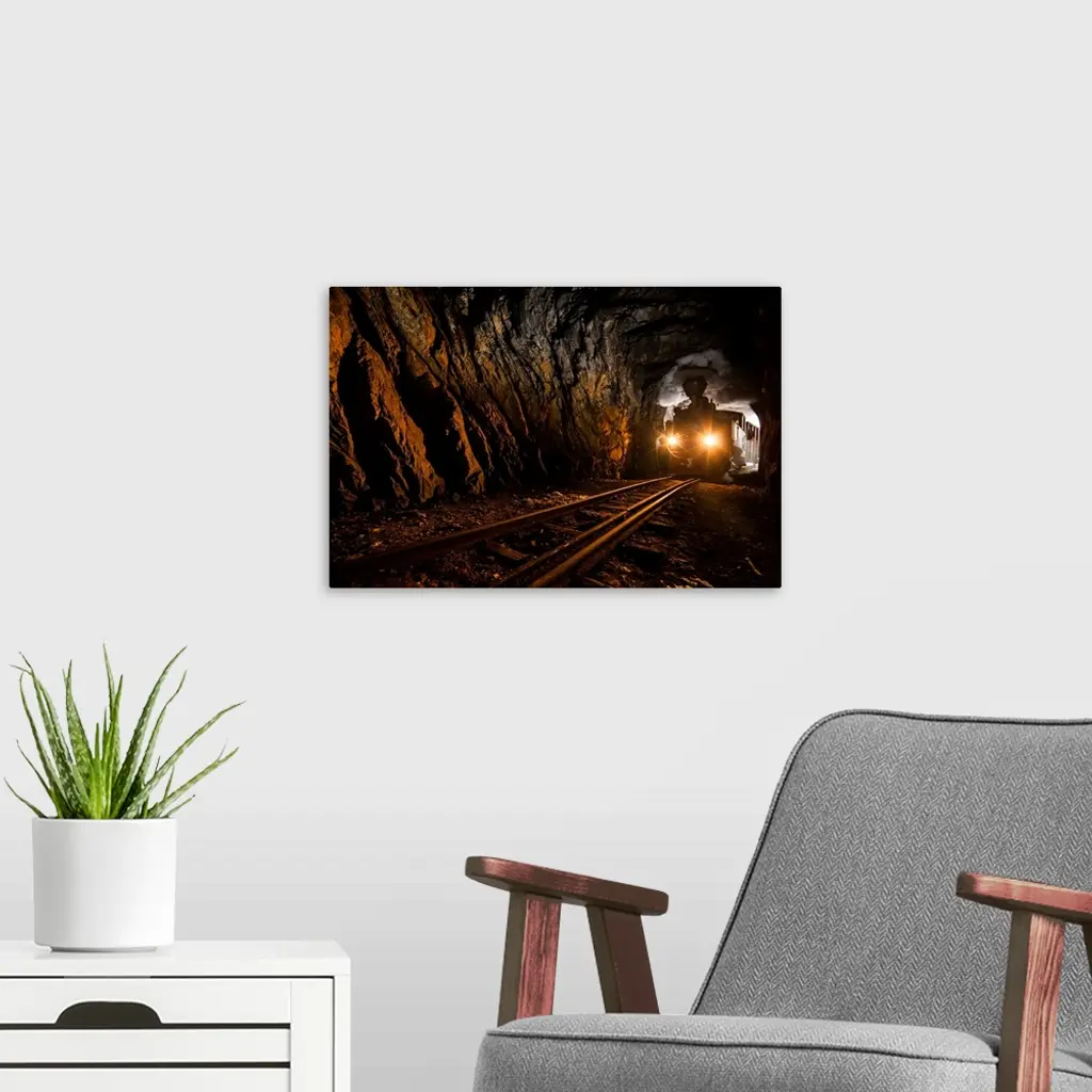 Silhouette of a train barreling through a tunnel, with smoke pouring from the stack.