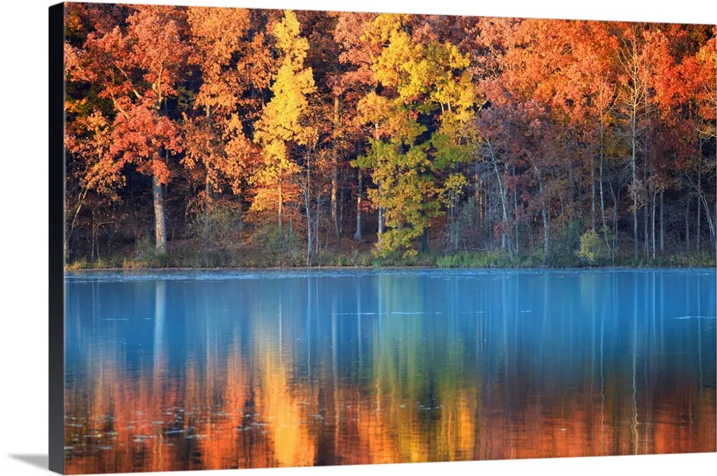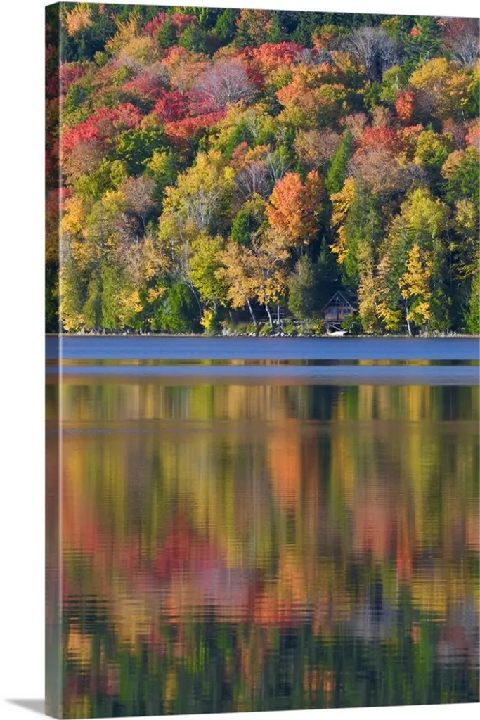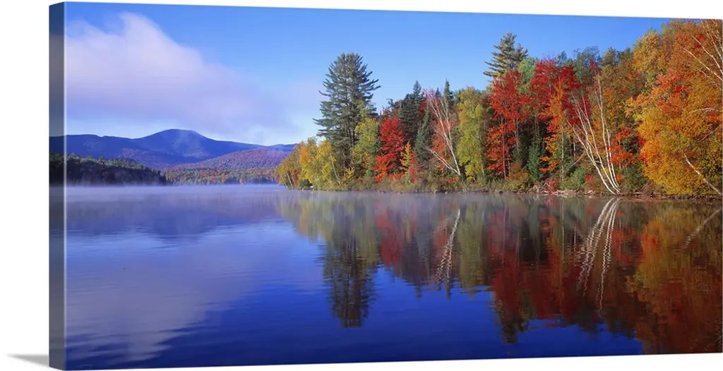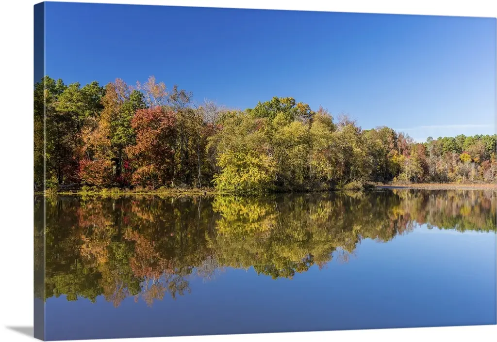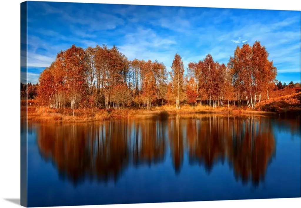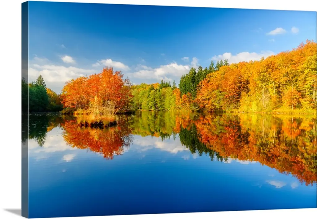 Trees in a variety of fall colors mirrored in a lake with a blue sky above.